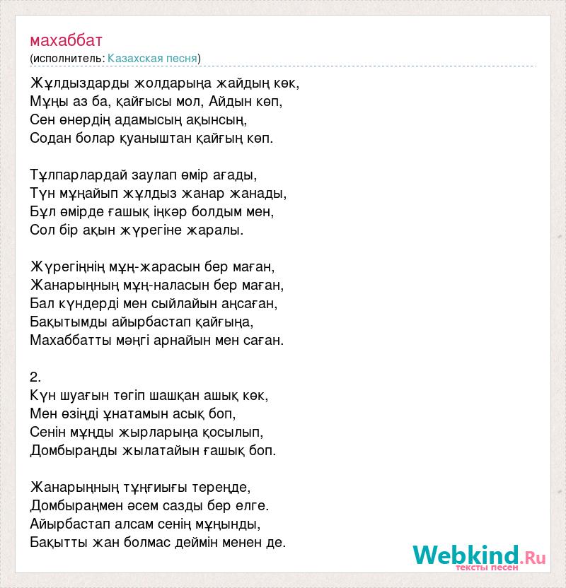 Жұлдыздарды жолдарыңа жайдың көк, Мұңы аз ба, қайғысы мол, Айдын көп, Сен өнердiң адамысың ақынсың, Содан болар қуаныштан қайғың көп. Тұлпарлардай заулап өмiр ағады, Түн мұңайып жұлдыз жанар жанады, Бұл өмiрде ғашық іңкәр болдым мен, Сол бiр ақын жүрегiне жаралы. Жүрегiңнiң мұң-жарасын бер маған, Жанарыңның мұң-наласын бер маған, Бал күндердi мен сыйлайын аңсаған, Бақытымды айырбастап қайғыңа, Махаббатты мәңгi арнайын мен саған. 2. Күн шуағын төгiп шашқан ашық көк, Мен өзiңдi ұнатамын асық боп, Сенiн мұңды жырларыңа қосылып, Домбыраңды жылатайын ғашық боп. Жанарыңның тұңғиығы тереңде, Домбыраңмен әсем сазды бер елге. Айырбастап алсам сенiң мұңынды, Бақытты жан болмас деймiн менен де.