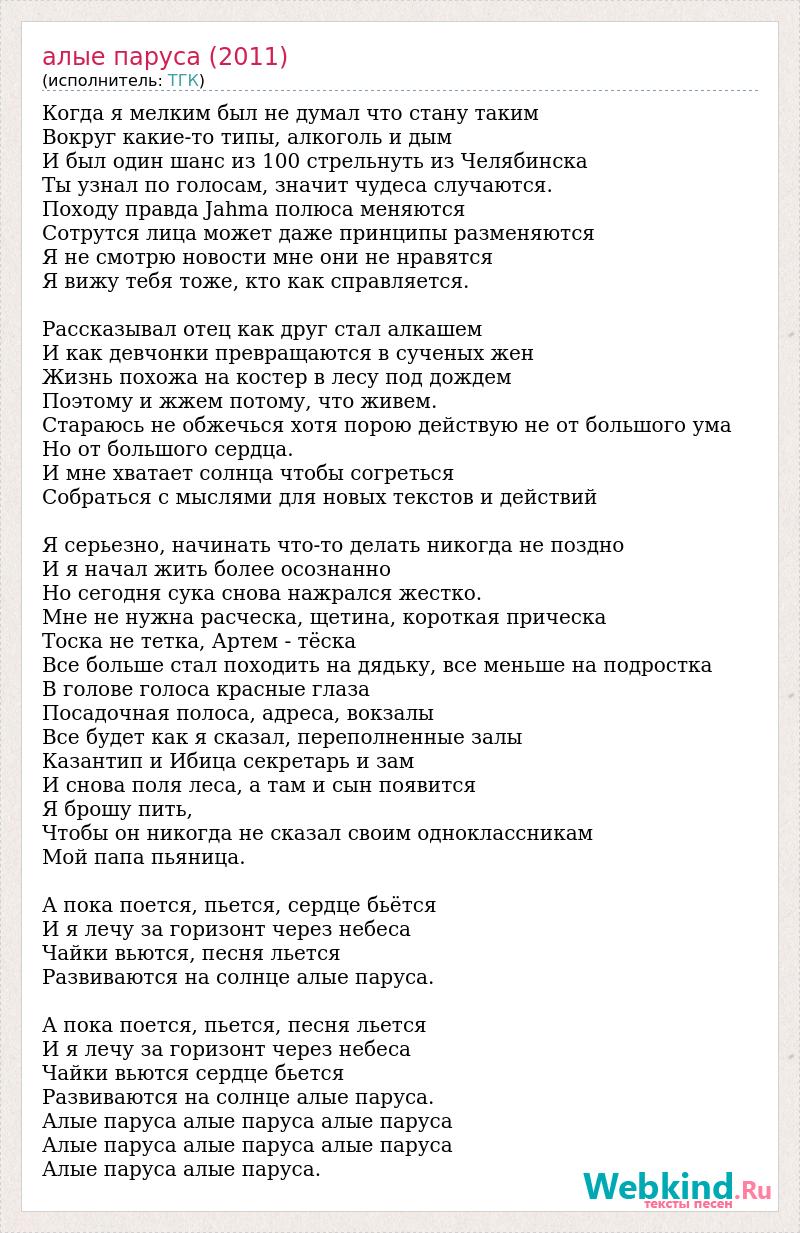 Когда я мелким был не думал что стану таким Вокруг какие-то типы, алкоголь и дым И был один шанс из 100 стрельнуть из Челябинска Ты узнал по голосам, значит чудеса случаются. Походу правда Jahma полюса меняются Сотрутся лица может даже принципы разменяются Я не смотрю новости мне они не нравятся Я вижу тебя тоже, кто как справляется. Рассказывал отец как друг стал алкашем И как девчонки превращаются в сученых жен Жизнь похожа на костер в лесу под дождем Поэтому и жжем потому, что живем. Стараюсь не обжечься хотя порою действую не от большого ума Но от большого сердца. И мне хватает солнца чтобы согреться Собраться с мыслями для новых текстов и действий Я серьезно, начинать что-то делать никогда не поздно И я начал жить более осознанно Но сегодня сука снова нажрался жестко. Мне не нужна расческа, щетина, короткая прическа Тоска не тетка, Артем - тёска Все больше стал походить на дядьку, все меньше на подростка В голове голоса красные глаза Посадочная полоса, адреса, вокзалы Все будет как я сказал, переполненные залы Казантип и Ибица секретарь и зам И снова поля леса, а там и сын появится Я брошу пить, Чтобы он никогда не сказал своим одноклассникам Мой папа пьяница. А пока поется, пьется, сердце бьётся И я лечу за горизонт через небеса Чайки вьются, песня льется Развиваются на солнце алые паруса. А пока поется, пьется, песня льется И я лечу за горизонт через небеса Чайки вьются сердце бьется Развиваются на солнце алые паруса. Алые паруса алые паруса алые паруса Алые паруса алые паруса алые паруса Алые паруса алые паруса.