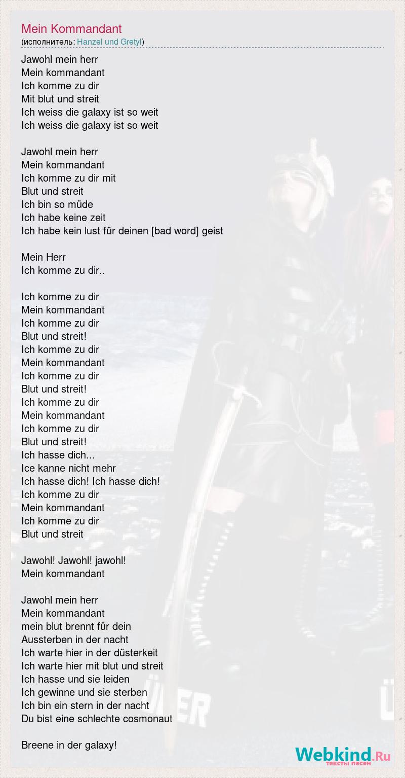 Jawohl mein herr Mein kommandant Ich komme zu dir Mit blut und streit Ich weiss die galaxy ist so weit Ich weiss die galaxy ist so weit Jawohl mein herr Mein kommandant Ich komme zu dir mit Blut und streit Ich bin so müde Ich habe keine zeit Ich habe kein lust für deinen [bad word] geist Mein Herr Ich komme zu dir.. Ich komme zu dir Mein kommandant Ich komme zu dir Blut und streit! Ich komme zu dir Mein kommandant Ich komme zu dir Blut und streit! Ich komme zu dir Mein kommandant Ich komme zu dir Blut und streit! Ich hasse dich... Ice kanne nicht mehr Ich hasse dich! Ich hasse dich! Ich komme zu dir Mein kommandant Ich komme zu dir Blut und streit Jawohl! Jawohl! jawohl! Mein kommandant Jawohl mein herr Mein kommandant mein blut brennt für dein Aussterben in der nacht Ich warte hier in der düsterkeit Ich warte hier mit blut und streit Ich hasse und sie leiden Ich gewinne und sie sterben Ich bin ein stern in der nacht Du bist eine schlechte cosmonaut Breene in der galaxy!