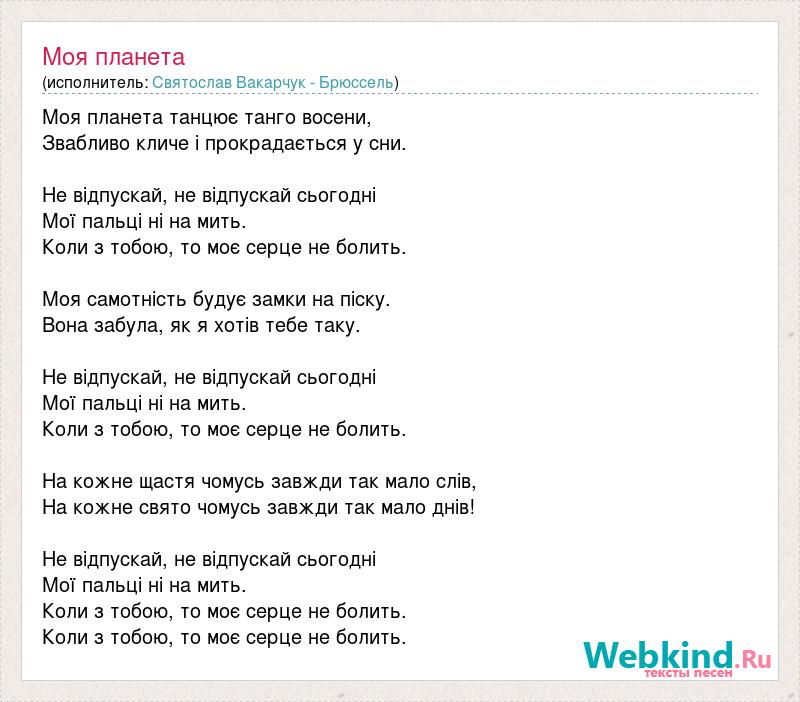 Моя планета танцює танго восени, Звабливо кличе і прокрадається у сни. Не відпускай, не відпускай сьогодні Мої пальці ні на мить. Коли з тобою, то моє серце не болить. Моя самотність будує замки на піску. Вона забула, як я хотів тебе таку. Не відпускай, не відпускай сьогодні Мої пальці ні на мить. Коли з тобою, то моє серце не болить. На кожне щастя чомусь завжди так мало слів, На кожне свято чомусь завжди так мало днів! Не відпускай, не відпускай сьогодні Мої пальці ні на мить. Коли з тобою, то моє серце не болить. Коли з тобою, то моє серце не болить.