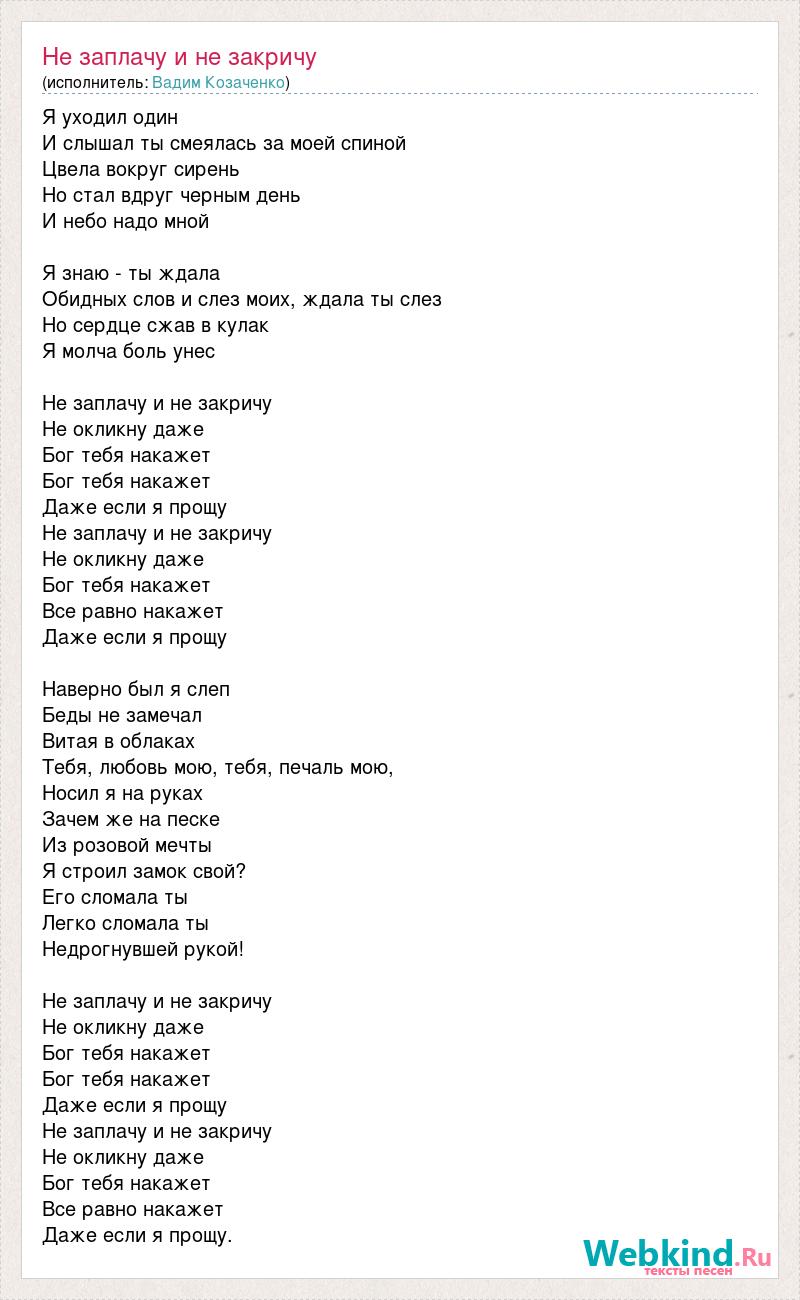 Я уходил один И слышал ты смеялась за моей спиной Цвела вокруг сирень Но стал вдруг черным день И небо надо мной Я знаю - ты ждала Обидных слов и слез моих, ждала ты слез Но сердце сжав в кулак Я молча боль унес Не заплачу и не закричу Не окликну даже Бог тебя накажет Бог тебя накажет Даже если я прощу Не заплачу и не закричу Не окликну даже Бог тебя накажет Все равно накажет Даже если я прощу Наверно был я слеп Беды не замечал Витая в облаках Тебя, любовь мою, тебя, печаль мою, Носил я на руках Зачем же на песке Из розовой мечты Я строил замок свой? Его сломала ты Легко сломала ты Недрогнувшей рукой! Не заплачу и не закричу Не окликну даже Бог тебя накажет Бог тебя накажет Даже если я прощу Не заплачу и не закричу Не окликну даже Бог тебя накажет Все равно накажет Даже если я прощу.