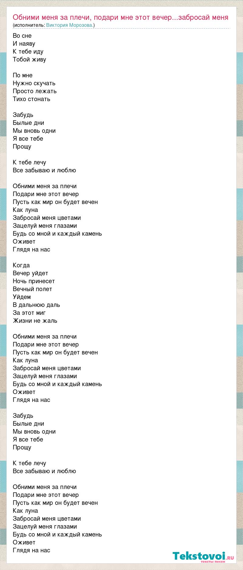 Во сне И наяву К тебе иду Тобой живу По мне Нужно скучать Просто лежать Тихо стонать Забудь Былые дни Мы вновь одни Я все тебе Прощу К тебе лечу Все забываю и люблю Обними меня за плечи Подари мне этот вечер Пусть как мир он будет вечен Как луна Забросай меня цветами Зацелуй меня глазами Будь со мной и каждый камень Оживет Глядя на нас Когда Вечер уйдет Ночь принесет Вечный полет Уйдем В дальнюю даль За этот миг Жизни не жаль Обними меня за плечи Подари мне этот вечер Пусть как мир он будет вечен Как луна Забросай меня цветами Зацелуй меня глазами Будь со мной и каждый камень Оживет Глядя на нас Забудь Былые дни Мы вновь одни Я все тебе Прощу К тебе лечу Все забываю и люблю Обними меня за плечи Подари мне этот вечер Пусть как мир он будет вечен Как луна Забросай меня цветами Зацелуй меня глазами Будь со мной и каждый камень Оживет Глядя на нас