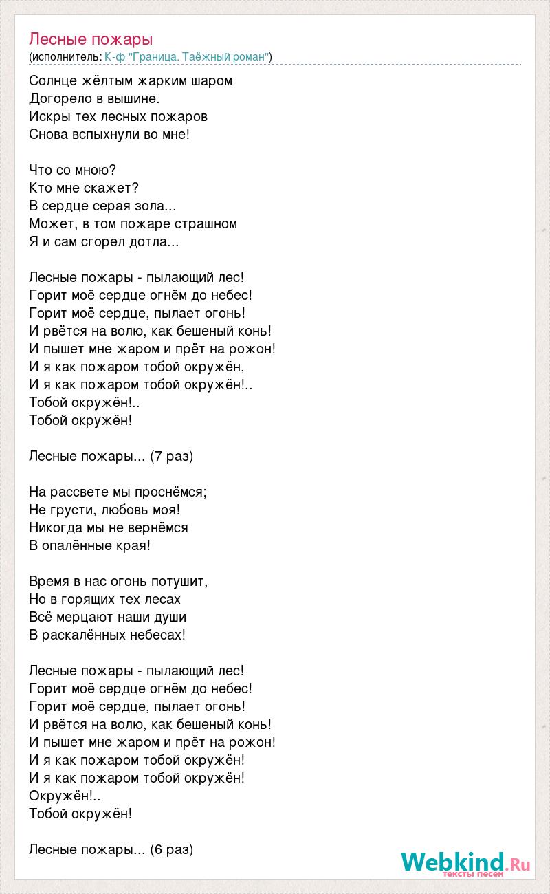 Солнце жёлтым жарким шаром Догорело в вышине. Искры тех лесных пожаров Снова вспыхнули во мне! Что со мною? Кто мне скажет? В сердце серая зола... Может, в том пожаре страшном Я и сам сгорел дотла... Лесные пожары - пылающий лес! Горит моё сердце огнём до небес! Горит моё сердце, пылает огонь! И рвётся на волю, как бешеный конь! И пышет мне жаром и прёт на рожон! И я как пожаром тобой окружён, И я как пожаром тобой окружён!.. Тобой окружён!.. Тобой окружён! Лесные пожары... (7 раз) На рассвете мы проснёмся; Не грусти, любовь моя! Никогда мы не вернёмся В опалённые края! Время в нас огонь потушит, Но в горящих тех лесах Всё мерцают наши души В раскалённых небесах! Лесные пожары - пылающий лес! Горит моё сердце огнём до небес! Горит моё сердце, пылает огонь! И рвётся на волю, как бешеный конь! И пышет мне жаром и прёт на рожон! И я как пожаром тобой окружён! И я как пожаром тобой окружён! Окружён!.. Тобой окружён! Лесные пожары... (6 раз)