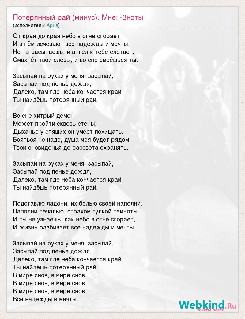 От края до края небо в огне сгорает И в нём исчезают все надежды и мечты, Но ты засыпаешь, и ангел к тебе слетает, Смахнёт твои слезы, и во сне смеёшься ты. 3асыпай на руках у меня, засыпай, Засыпай под пенье дождя, Далеко, там где неба кончается край, Ты найдёшь потерянный рай. Во сне хитрый демон Может пройти сквозь стены, Дыханье у спящих он умеет похищать. Бояться не надо, душа моя будет рядом Твои сновиденья до рассвета охранять. 3асыпай на руках у меня, засыпай, Засыпай под пенье дождя, Далеко, там где неба кончается край, Ты найдёшь потерянный рай. Подставлю ладони, их болью своей наполни, Наполни печалью, страхом гулкой темноты. И ты не узнаешь, как небо в огне сгорает, И жизнь разбивает все надежды и мечты. 3асыпай на руках у меня, засыпай, Засыпай под пенье дождя, Далеко, там где неба кончается край, Ты найдёшь потерянный рай. В мире снов, в мире снов. В мире снов, в мире снов. В мире снов, в мире снов. Все надежды и мечты.