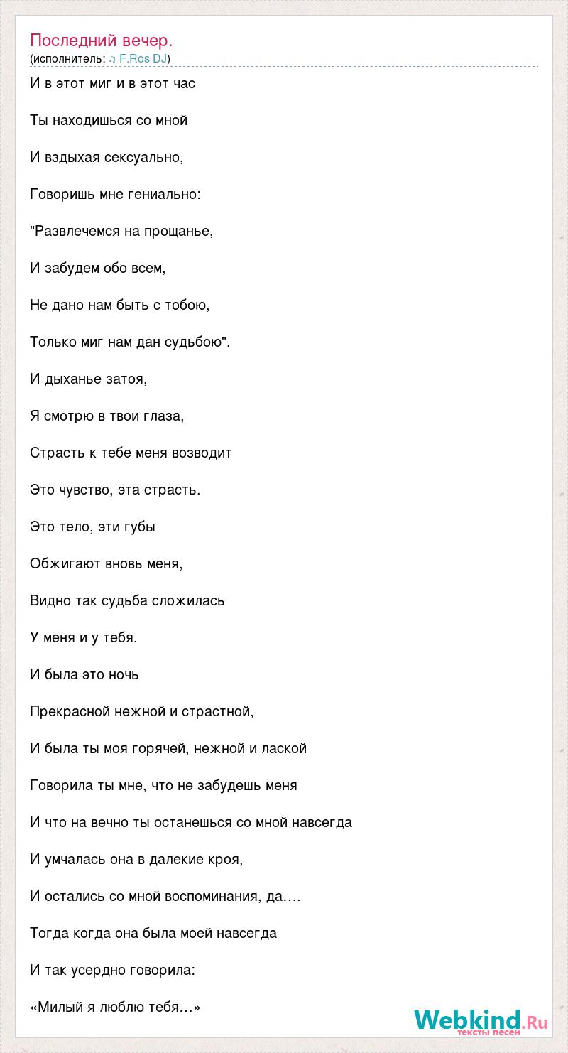 И в этот миг и в этот час Ты находишься со мной И вздыхая сексуально, Говоришь мне гениально: "Развлечемся на прощанье, И забудем обо всем, Не дано нам быть с тобою, Только миг нам дан судьбою". И дыханье затоя, Я смотрю в твои глаза, Страсть к тебе меня возводит Это чувство, эта страсть. Это тело, эти губы Обжигают вновь меня, Видно так судьба сложилась У меня и у тебя. И была это ночь Прекрасной нежной и страстной, И была ты моя горячей, нежной и лаской Говорила ты мне, что не забудешь меня И что на вечно ты останешься со мной навсегда И умчалась она в далекие кроя, И остались со мной воспоминания, да…. Тогда когда она была моей навсегда И так усердно говорила: «Милый я люблю тебя…»