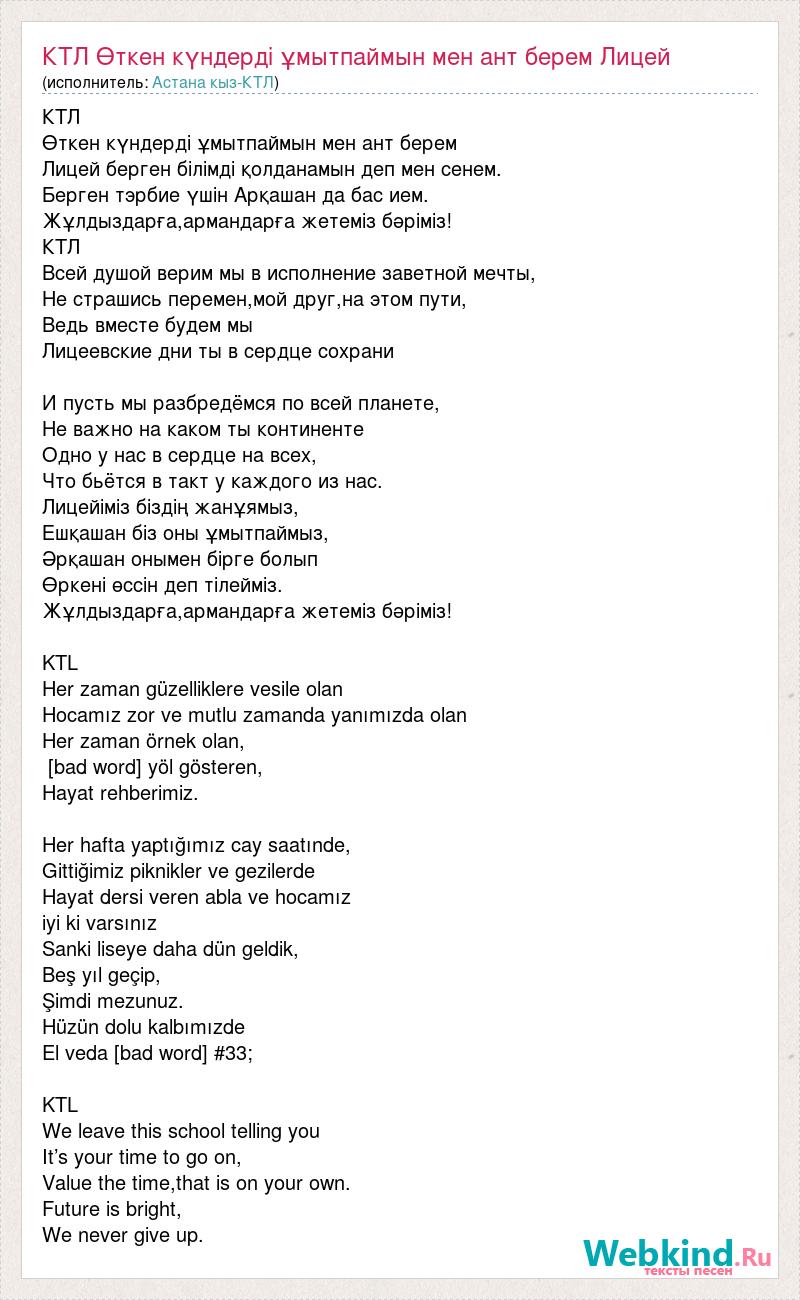 КТЛ Өткен күндерді ұмытпаймын мен ант берем Лицей берген білімді қолданамын деп мен сенем. Берген тэрбие үшін Арқашан да бас ием. Жұлдыздарға,армандарға жетеміз бәріміз! КТЛ Всей душой верим мы в исполнение заветной мечты, Не страшись перемен,мой друг,на этом пути, Ведь вместе будем мы Лицеевские дни ты в сердце сохрани И пусть мы разбредёмся по всей планете, Не важно на каком ты континенте Одно у нас в сердце на всех, Что бьётся в такт у каждого из нас. Лицейіміз біздің жанұямыз, Ешқашан біз оны ұмытпаймыз, Әрқашан онымен бірге болып Өркені өссін деп тілейміз. Жұлдыздарға,армандарға жетеміз бәріміз! KTL Her zaman güzelliklere vesile olan Hocamız zor ve mutlu zamanda yanımızda olan Her zaman örnek olan, [bad word] yöl gösteren, Hayat rehberimiz. Her hafta yaptığımız cay saatınde, Gittiğimiz piknikler ve gezilerde Hayat dersi veren abla ve hocamız iyi ki varsınız Sanki liseye daha dün geldik, Beş yıl geçip, Şimdi mezunuz. Hüzün dolu kalbımızde El veda [bad word] #33; KTL We leave this school telling you It’s your time to go on, Value the time,that is on your own. Future is bright, We never give up.