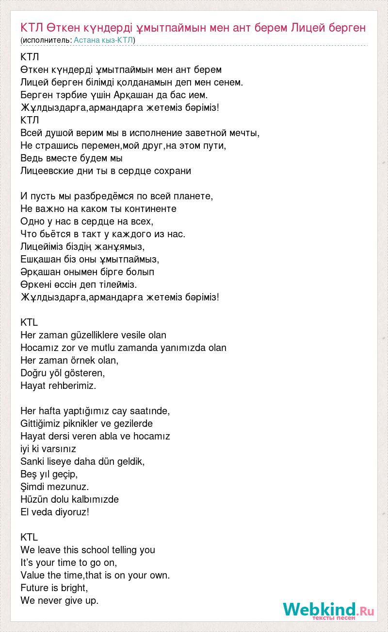 КТЛ Өткен күндерді ұмытпаймын мен ант берем Лицей берген білімді қолданамын деп мен сенем. Берген тэрбие үшін Арқашан да бас ием. Жұлдыздарға,армандарға жетеміз бәріміз! КТЛ Всей душой верим мы в исполнение заветной мечты, Не страшись перемен,мой друг,на этом пути, Ведь вместе будем мы Лицеевские дни ты в сердце сохрани И пусть мы разбредёмся по всей планете, Не важно на каком ты континенте Одно у нас в сердце на всех, Что бьётся в такт у каждого из нас. Лицейіміз біздің жанұямыз, Ешқашан біз оны ұмытпаймыз, Әрқашан онымен бірге болып Өркені өссін деп тілейміз. Жұлдыздарға,армандарға жетеміз бәріміз! KTL Her zaman güzelliklere vesile olan Hocamız zor ve mutlu zamanda yanımızda olan Her zaman örnek olan, Doğru yöl gösteren, Hayat rehberimiz. Her hafta yaptığımız cay saatınde, Gittiğimiz piknikler ve gezilerde Hayat dersi veren abla ve hocamız iyi ki varsınız Sanki liseye daha dün geldik, Beş yıl geçip, Şimdi mezunuz. Hüzün dolu kalbımızde El veda diyoruz! KTL We leave this school telling you It’s your time to go on, Value the time,that is on your own. Future is bright, We never give up.