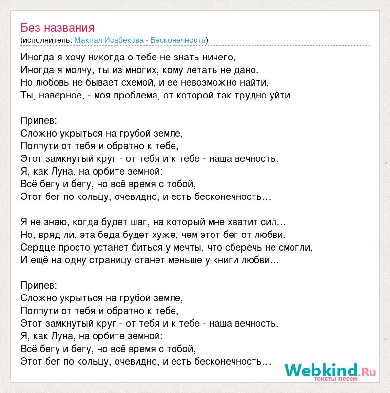 Иногда я хочу никогда о тебе не знать ничего, Иногда я молчу, ты из многих, кому летать не дано. Но любовь не бывает схемой, и её невозможно найти, Ты, наверное, - моя проблема, от которой так трудно уйти. Припев: Сложно укрыться на грубой земле, Полпути от тебя и обратно к тебе, Этот замкнутый круг - от тебя и к тебе - наша вечность. Я, как Луна, на орбите земной: Всё бегу и бегу, но всё время с тобой, Этот бег по кольцу, очевидно, и есть бесконечность… Я не знаю, когда будет шаг, на который мне хватит сил… Но, вряд ли, эта беда будет хуже, чем этот бег от любви. Сердце просто устанет биться у мечты, что сберечь не смогли, И ещё на одну страницу станет меньше у книги любви… Припев: Сложно укрыться на грубой земле, Полпути от тебя и обратно к тебе, Этот замкнутый круг - от тебя и к тебе - наша вечность. Я, как Луна, на орбите земной: Всё бегу и бегу, но всё время с тобой, Этот бег по кольцу, очевидно, и есть бесконечность…