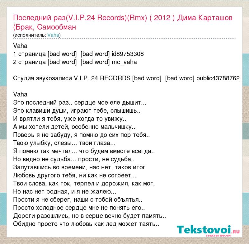 Vaha 1 страница [bad word] [bad word] id89753308 2 страница [bad word] [bad word] mc_vaha Студия звукозаписи V.I.P. 24 RECORDS [bad word] [bad word] public43788762 Vaha Это последний раз.. сердце мое еле дышит... Это клавиши души, играют тебе, слышишь.. И врятли я тебя, уже когда то увижу.. А мы хотели детей, особенно мальчишку.. Поверь я не забуду, я помню до сих пор тебя.. Твою улыбку, слезы... твои глаза... Я помню так мечтал... что будем вместе всегда.. Но видно не судьба... прости, не судьба.. Запутавшись во времени, нас нет, таков итог Любовь другого тебя, ни как не согреет... Твои слова, как ток, терпел и дорожил, как мог, Но нас нет родная, и я не жалею... Прости я не сберег, наши с тобой объятья.. Просто холодное сердце мне не понять его.. Дороги разошлись, но в серце вечно будет память.. Обидно просто что любовь как лед может таять..