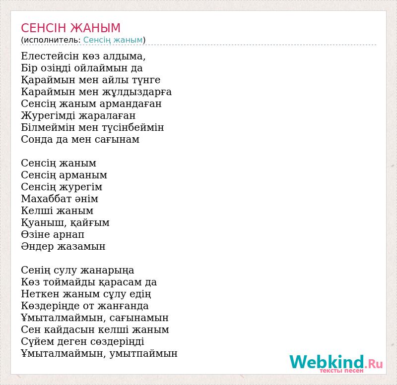 Елестейсін көз алдыма, Бір озіңді ойлаймын да Қараймын мен айлы түнге Караймын мен жұлдыздарға Сенсің жаным армандаған Журегімді жаралаған Білмеймін мен түсінбеймін Сонда да мен сағынам Сенсің жаным Сенсің арманым Сенсің журегім Махаббат әнім Келші жаным Қуаныш, қайғым Өзіне арнап Әндер жазамын Сенің сулу жанарыңа Көз тоймайды қарасам да Неткен жаным сұлу едің Көздеріңде от жанғанда Ұмыталмаймын, сағынамын Сен кайдасын келші жаным Сүйем деген сөздеріңді Ұмыталмаймын, умытпаймын