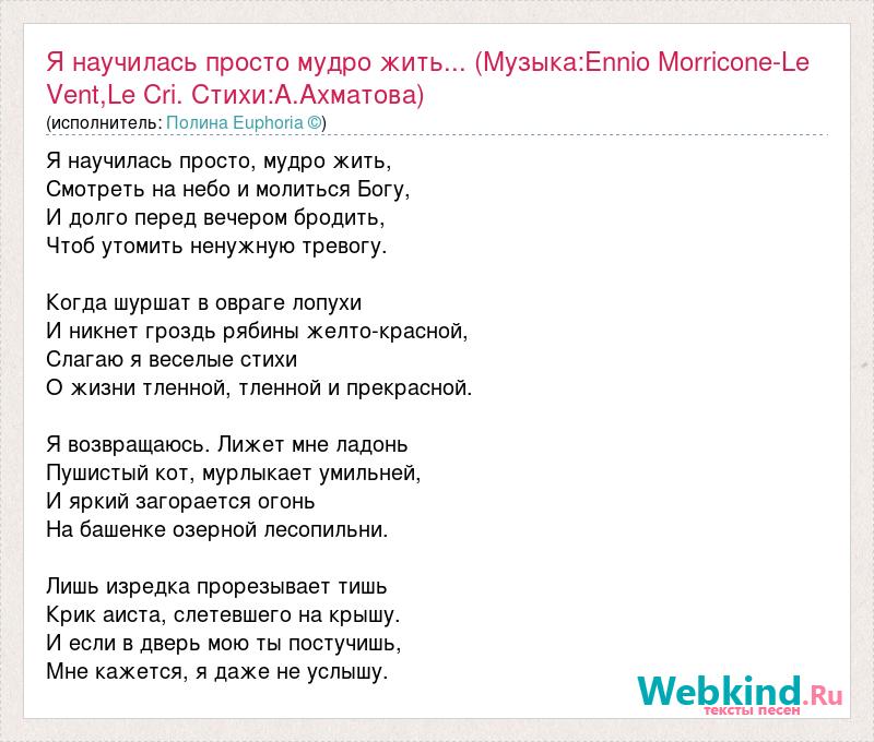 А как ты думаешь, о чем песня "Я научилась просто мудро жить... (Музыка:Ennio Morricone-Le Vent,Le Cri. Стих" ?