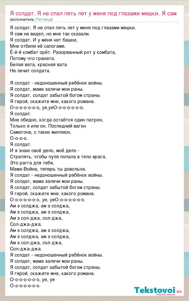 Я солдат. Я не спал пять лет у меня под глазами мешки. Я сам не видел, но мне так сказали. Я солдат. И у меня нет башки, Мне отбили её сапогами. Ё-ё-ё комбат орёт. Разорванный рот у комбата, Потому что граната. Белая вата, красная вата Hе лечит солдата. Я солдат - недоношенный ребёнок войны. Я солдат, мама залечи мои раны. Я солдат, солдат забытой богом страны. Я герой, скажите мне, какого романа. О-о-о-о-о-о-о, уе,уеО-о-о-о-о-о-о. Я солдат. Мне обидно, когда остаётся один патрон, Только я или он. Последний вагон Самогона, с таких миллион, О-о-о-о. Я солдат. И я знаю своё дело, моё дело - Стрелять, чтобы пуля попала в тело врага. Это рагга для тебя, Мама-Война, теперь ты довольна. Я солдат - недоношенный ребёнок войны. Я солдат, мама залечи мои раны. Я солдат, солдат забытой богом страны. Я герой, скажите мне, какого романа. О-о-о-о-о-о-о, уе, уеО-о-о-о-о-о-о. Ам э солджа, ам э солджа, Ам э солджа, ам э солджа, Ам э сол-джа, сол-джа, Сол-джа-джа. Ам э солджа, ам э солджа, Ам э солджа, ам э солджа, Ам э сол-джа, сол-джа, Сол-джа-джа. Я солдат - недоношенный ребёнок войны. Я солдат, мама залечи мои раны. Я солдат, солдат забытой богом страны. Я герой, скажите мне, какого романа. О-о-о-о-о-о-о, уе, уе О-о-о-о-о-о-о.