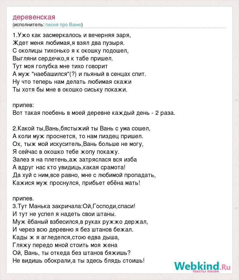 1.Ужо как засмеркалось и вечерняя заря, Ждет меня любимая,я взял два пузыря. С околицы тихонько я к окошку подошел, Выгляни сердечко,я к табе пришел. Тут моя голубка мне тихо говорит А муж "наебашился"(?) и пьяный в сенцах спит. Ну что теперь нам делать любимая скажи Ты хотя бы мне в окошко сиську покажи. припев: Вот такая поебень в моей деревне каждый день - 2 раза. 2.Какой ты,Вань,бястыжий ты Вань с ума сошел, А коли муж проснется, то нам пиздец пришел. Ох, тыж мой искуситель,Вань больше не могу, Я сейчас в окошко тебе жопу покажу. Залез я на плетень,аж затряслася вся изба А вдруг нас кто увидиць,какая срамота! Да хуй с ним,все равно, мне с любимой пропадать, Кажися муж проснулся, прибьет ебёна мать! припев. 3.Тут Манька закричала:Ой,Господи,спаси! И тут не успел я надеть свои штаны. Муж ёбаный взбесился,в руках ружжо держал, И через всю деревню я без штанов бежал. Кады ж я агледелся,стою едва дыша, Гляжу передо мной стоить моя жена Ой, Вань, ты откеда без штанов бяжишь? Не видишь обокрали,а ты здесь блядь стоишь!