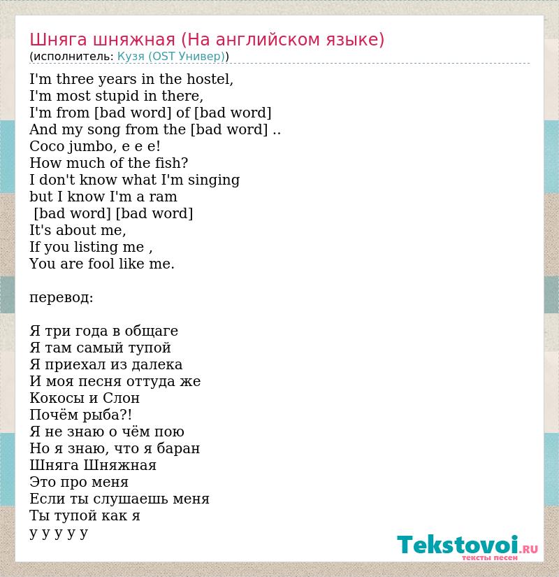 I'm three years in the hostel, I'm most stupid in there, I'm from [bad word] of [bad word] And my song from the [bad word] .. Coco jumbo, e e e! How much of the fish? I don't know what I'm singing but I know I'm a ram [bad word] Shitable, It's about me, If you listing me , You are fool like me. перевод: Я три года в общаге Я там самый тупой Я приехал из далека И моя песня оттуда же Кокосы и Слон Почём рыба?! Я не знаю о чём пою Но я знаю, что я баран Шняга Шняжная Это про меня Если ты слушаешь меня Ты тупой как я у у у у у