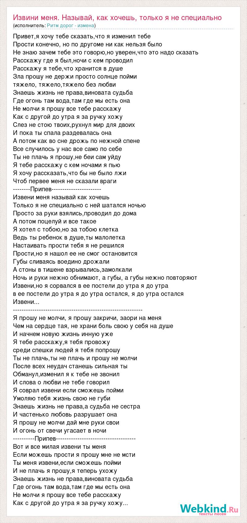 Привет,я хочу тебе сказать,что я изменил тебе Прости конечно, но по другоме ни как нельзя было Не знаю зачем тебе это говорю,но уверен,что это надо сказать Расскажу где я был,ночи с кем проводил Расскажу я тебе,что хранится в душе Зла прошу не держи просто солнце пойми тяжело, тяжело,тяжело без любви Знаешь жизнь не права,виновата судьба Где огонь там вода,там где мы есть она Не молчи я прошу все тебе расскажу Как с другой до утра я за ручку хожу Слез не стою твоих,рухнул мир для двоих И пока ты спала раздевалась она А потом как во сне дрожь по нежной спене Все случилось у нас все само по себе Ты не плачь я прошу,не беи сам уйду Я тебе расскажу с кем ночами я пью Я хочу рассказать,что бы не было лжи Чтоб первее меня не сказали враги --------Припев----------------------- Извени меня называй как хочешь Только я не специально с ней шатался ночью Просто за руки взялись,проводил до дома А потом поцелуй и все такое Я хотел с тобою,но за тобою клетка Ведь ты ребенок в душе,ты малолетка Настаивать прости тебя я не решился Прости,но я нашол ее не смог остановится Губы сливаясь воедино дрожали А стоны в тишене взрывались,замолкали Ночь и руки нежно обнимают, а губы, а губы нежно повторяют Извени,но я сорвался в ее постели до утра я до утра в ее постели до утра я до утра остался, я до утра остался Извени... ------------------------------------------------------------ Я прошу не молчи, я прошу закричи, заори на меня Чем на сердце тая, не храни боль свою у себя на душе И начнем новую жизнь инную уже Я тебе расскажу,я тебя провожу среди спешки людей я тебя попрошу Ты не плачь,ты не плачь и прошу не молчи После всех неудач станешь сильная ты Обманул,изменил я к тебе не звонил И слова о любви не тебе говорил Я соврал извени если сможешь пойми Умоляю тебя жизнь свою не губи Знаешь жизнь не права,а судьба не сестра И частенько любовь разрушает она Я прошу не молчи дай мне руки свои И огонь от свечи угасает в ночи ----------Припев------------------------------------- Вот и все милая извени ты меня Если можешь прости я прошу мне не мсти Ты меня извени,если сможешь пойми И не плачь я прошу,я теперь ухожу Знаешь жизнь не права,виновата судьба Где огонь там вода,там где мы есть она Не молчи я прошу все тебе расскажу Как с другой до утра я за ручку хожу...