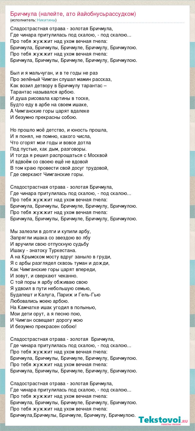 Сладострастная отрава - золотая Бричмула, Где чинара притулилась под скалою, - под скалою... Про тебя жужжит над ухом вечная пчела: Бричмула, Бричмулы, Бричмуле, Бричмулу, Бричмулою. Про тебя жужжит над ухом вечная пчела: Бричмула, Бричмулы, Бричмуле, Бричмулу, Бричмулою. Был и я мальчуган, и в те годы не раз Про зелёный Чимган слушал мамин рассказ, Как возил детвору в Бричмулу тарантас – Тарантас назывался арбою. И душа рисовала картины в тоске, Будто еду в арбе на своем ишаке, А Чимганские горы царят вдалеке И безумно прекрасны собою. Но прошло моё детство, и юность прошла, И я понял, не помню, какого числа, Что сгорят мои годы и вовсе дотла Под пустые, как дым, разговоры. И тогда я решил распрощаться с Москвой И вдвоём со своею ещё не вдовой В том краю провести свой досуг трудовой, Где сверкают Чимганские горы. Сладострастная отрава - золотая Бричмула, Где чинара притулилась под скалою, - под скалою... Про тебя жужжит над ухом вечная пчела: Бричмула, Бричмулы, Бричмуле, Бричмулу, Бричмулою. Про тебя жужжит над ухом вечная пчела: Бричмула, Бричмулы, Бричмуле, Бричмулу, Бричмулою. Мы залезли в долги и купили арбу, Запрягли ишака со звездою во лбу И вручили свою отпускную судьбу Ишаку - знатоку Туркестана. А на Крымском мосту вдруг заныло в груди, Я с арбы разглядел сквозь туман и дожди, Как Чимганские горы царят впереди, И зовут, и сверкают чеканно. С той поры я арбу обживаю свою Я удвоил в пути небольшую семью, Будапешт и Калуга, Париж и Гель-Гью Любовались моею арбою. На Камчатке ишак угодил в полынью, Мои дети орут, а я песню пою, И Чимган освещает дорогу мою И безумно прекрасен собою! Сладострастная отрава - золотая Бричмула, Где чинара притулилась под скалою, - под скалою... Про тебя жужжит над ухом вечная пчела: Бричмула, Бричмулы, Бричмуле, Бричмулу, Бричмулою. Про тебя жужжит над ухом вечная пчела: Бричмула, Бричмулы, Бричмуле, Бричмулу, Бричмулою. Сладострастная отрава - золотая Бричмула, Где чинара притулилась под скалою, - под скалою... Про тебя жужжит над ухом вечная пчела: Бричмула, Бричмулы, Бричмуле, Бричмулу, Бричмулою. Про тебя жужжит над ухом вечная пчела: Бричмула,Бричмулы, Бричмуле, Бричмулу, Бричмулою.