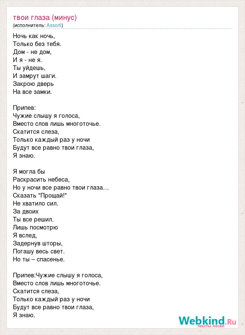 Ночь как ночь, Только без тебя. Дом - не дом, И я - не я. Ты уйдешь, И замрут шаги. Закрою дверь На все замки. Припев: Чужие слышу я голоса, Вместо слов лишь многоточье. Скатится слеза, Только каждый раз у ночи Будут все равно твои глаза, Я знаю. Я могла бы Раскрасить небеса, Но у ночи все равно твои глаза… Сказать "Прощай!" Не хватило сил. За двоих Ты все решил. Лишь посмотрю Я вслед, Задернув шторы, Погашу весь свет. Но ты – спасенье. Припев:Чужие слышу я голоса, Вместо слов лишь многоточье. Скатится слеза, Только каждый раз у ночи Будут все равно твои глаза, Я знаю.