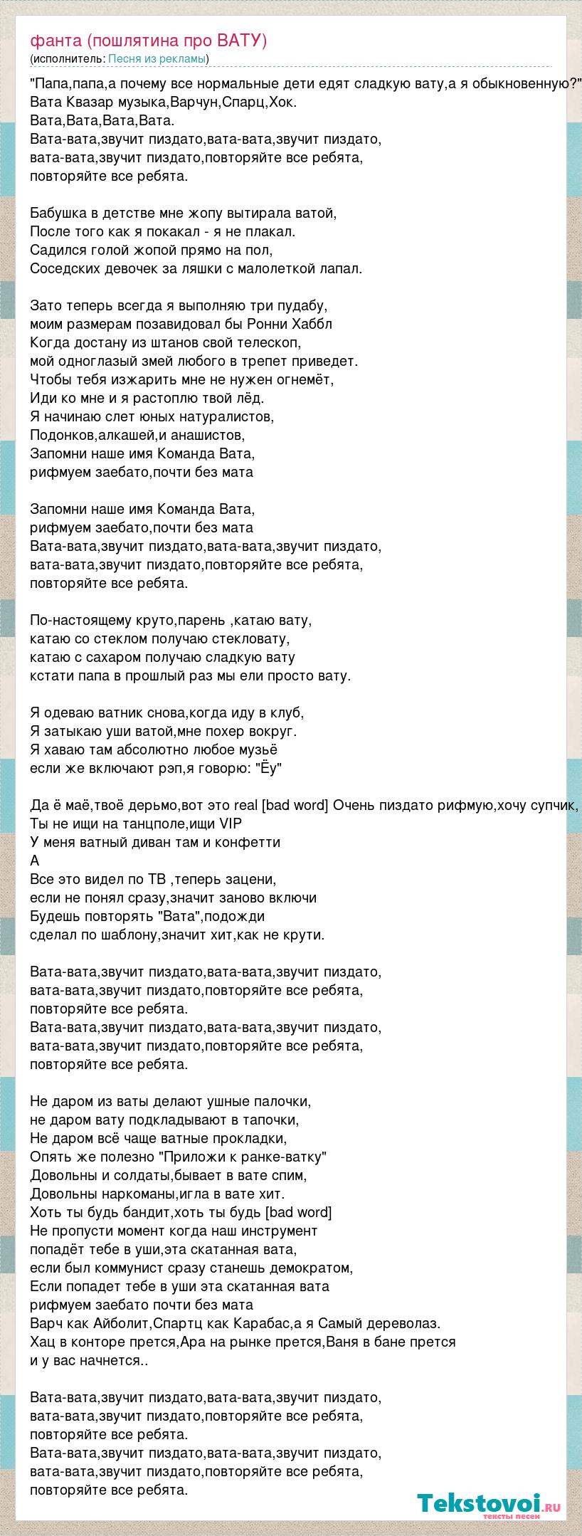 "Папа,папа,а почему все нормальные дети едят сладкую вату,а я обыкновенную?" Вата Квазар музыка,Варчун,Спарц,Хок. Вата,Вата,Вата,Вата. Вата-вата,звучит пиздато,вата-вата,звучит пиздато, вата-вата,звучит пиздато,повторяйте все ребята, повторяйте все ребята. Бабушка в детстве мне жопу вытирала ватой, После того как я покакал - я не плакал. Садился голой жопой прямо на пол, Соседских девочек за ляшки с малолеткой лапал. Зато теперь всегда я выполняю три пудабу, моим размерам позавидовал бы Ронни Хаббл Когда достану из штанов свой телескоп, мой одноглазый змей любого в трепет приведет. Чтобы тебя изжарить мне не нужен огнемёт, Иди ко мне и я растоплю твой лёд. Я начинаю слет юных натуралистов, Подонков,алкашей,и анашистов, Запомни наше имя Команда Вата, рифмуем заебато,почти без мата Запомни наше имя Команда Вата, рифмуем заебато,почти без мата Вата-вата,звучит пиздато,вата-вата,звучит пиздато, вата-вата,звучит пиздато,повторяйте все ребята, повторяйте все ребята. По-настоящему круто,парень ,катаю вату, катаю со стеклом получаю стекловату, катаю с сахаром получаю сладкую вату кстати папа в прошлый раз мы ели просто вату. Я одеваю ватник снова,когда иду в клуб, Я затыкаю уши ватой,мне похер вокруг. Я хаваю там абсолютно любое музьё если же включают рэп,я говорю: "Ёу" Да ё маё,твоё дерьмо,вот это real [bad word] Очень пиздато рифмую,хочу супчик, Ты не ищи на танцполе,ищи VIP У меня ватный диван там и конфетти А Все это видел по ТВ ,теперь зацени, если не понял сразу,значит заново включи Будешь повторять "Вата",подожди сделал по шаблону,значит хит,как не крути. Вата-вата,звучит пиздато,вата-вата,звучит пиздато, вата-вата,звучит пиздато,повторяйте все ребята, повторяйте все ребята. Вата-вата,звучит пиздато,вата-вата,звучит пиздато, вата-вата,звучит пиздато,повторяйте все ребята, повторяйте все ребята. Не даром из ваты делают ушные палочки, не даром вату подкладывают в тапочки, Не даром всё чаще ватные прокладки, Опять же полезно "Приложи к ранке-ватку" Довольны и солдаты,бывает в вате спим, Довольны наркоманы,игла в вате хит. Хоть ты будь бандит,хоть ты будь [bad word] Не пропусти момент когда наш инструмент попадёт тебе в уши,эта скатанная вата, если был коммунист сразу станешь демократом, Если попадет тебе в уши эта скатанная вата рифмуем заебато почти без мата Варч как Айболит,Спартц как Карабас,а я Самый дереволаз. Хац в конторе прется,Ара на рынке прется,Ваня в бане прется и у вас начнется.. Вата-вата,звучит пиздато,вата-вата,звучит пиздато, вата-вата,звучит пиздато,повторяйте все ребята, повторяйте все ребята. Вата-вата,звучит пиздато,вата-вата,звучит пиздато, вата-вата,звучит пиздато,повторяйте все ребята, повторяйте все ребята.