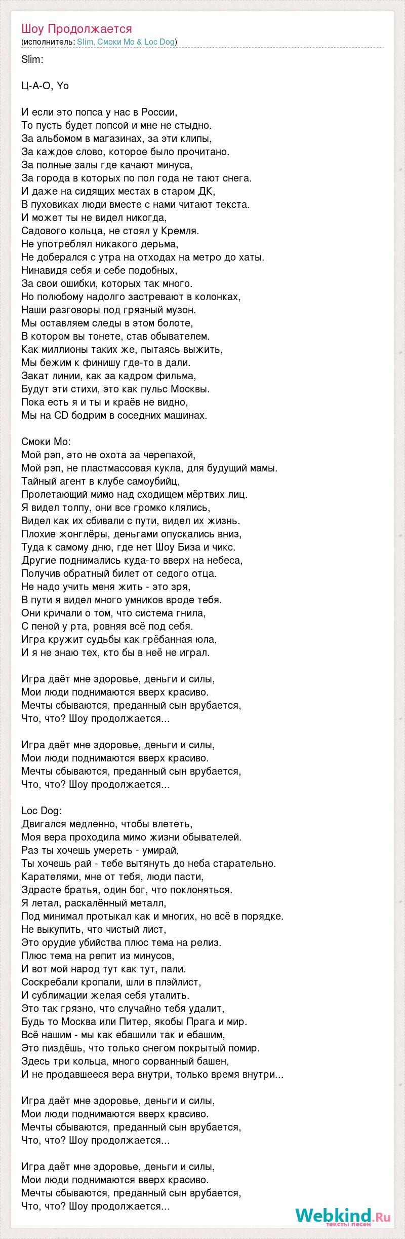 Slim: Ц-А-О, Yo И если это попса у нас в России, То пусть будет попсой и мне не стыдно. За альбомом в магазинах, за эти клипы, За каждое слово, которое было прочитано. За полные залы где качают минуса, За города в которых по пол года не тают снега. И даже на сидящих местах в старом ДК, В пуховиках люди вместе с нами читают текста. И может ты не видел никогда, Садового кольца, не стоял у Кремля. Не употреблял никакого дерьма, Не доберался с утра на отходах на метро до хаты. Нинавидя себя и себе подобных, За свои ошибки, которых так много. Но полюбому надолго застревают в колонках, Наши разговоры под грязный музон. Мы оставляем следы в этом болоте, В котором вы тонете, став обывателем. Как миллионы таких же, пытаясь выжить, Мы бежим к финишу где-то в дали. Закат линии, как за кадром фильма, Будут эти стихи, это как пульс Москвы. Пока есть я и ты и краёв не видно, Мы на CD бодрим в соседних машинах. Смоки Мо: Мой рэп, это не охота за черепахой, Мой рэп, не пластмассовая кукла, для будущий мамы. Тайный агент в клубе самоубийц, Пролетающий мимо над сходищем мёртвих лиц. Я видел толпу, они все громко клялись, Видел как их сбивали с пути, видел их жизнь. Плохие жонглёры, деньгами опускались вниз, Туда к самому дню, где нет Шоу Биза и чикс. Другие поднимались куда-то вверх на небеса, Получив обратный билет от седого отца. Не надо учить меня жить - это зря, В пути я видел много умников вроде тебя. Они кричали о том, что система гнила, С пеной у рта, ровняя всё под себя. Игра кружит судьбы как грёбанная юла, И я не знаю тех, кто бы в неё не играл. Игра даёт мне здоровье, деньги и силы, Мои люди поднимаются вверх красиво. Мечты сбываются, преданный сын врубается, Что, что? Шоу продолжается... Игра даёт мне здоровье, деньги и силы, Мои люди поднимаются вверх красиво. Мечты сбываются, преданный сын врубается, Что, что? Шоу продолжается... Loc Dog: Двигался медленно, чтобы влететь, Моя вера проходила мимо жизни обывателей. Раз ты хочешь умереть - умирай, Ты хочешь рай - тебе вытянуть до неба старательно. Карателями, мне от тебя, люди пасти, Здрасте братья, один бог, что поклоняться. Я летал, раскалённый металл, Под минимал протыкал как и многих, но всё в порядке. Не выкупить, что чистый лист, Это орудие убийства плюс тема на релиз. Плюс тема на репит из минусов, И вот мой народ тут как тут, пали. Соскребали кропали, шли в плэйлист, И сублимации желая себя уталить. Это так грязно, что случайно тебя удалит, Будь то Москва или Питер, якобы Прага и мир. Всё нашим - мы как ебашили так и ебашим, Это пиздёшь, что только снегом покрытый помир. Здесь три кольца, много сорванный башен, И не продавшееся вера внутри, только время внутри... Игра даёт мне здоровье, деньги и силы, Мои люди поднимаются вверх красиво. Мечты сбываются, преданный сын врубается, Что, что? Шоу продолжается... Игра даёт мне здоровье, деньги и силы, Мои люди поднимаются вверх красиво. Мечты сбываются, преданный сын врубается, Что, что? Шоу продолжается...
