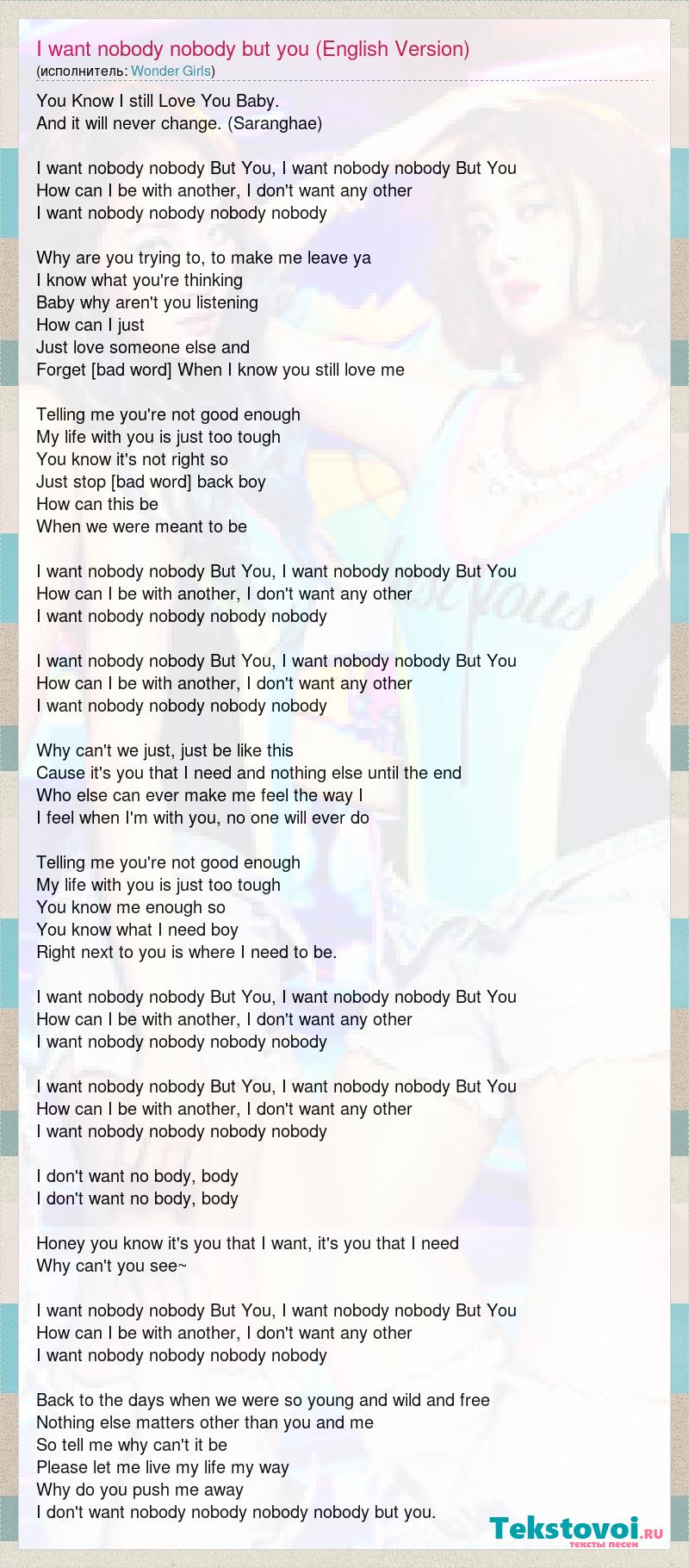 You Know I still Love You Baby. And it will never change. (Saranghae) I want nobody nobody But You, I want nobody nobody But You How can I be with another, I don't want any other I want nobody nobody nobody nobody Why are you trying to, to make me leave ya I know what you're thinking Baby why aren't you listening How can I just Just love someone else and Forget you completely When I know you still love me Telling me you're not good enough My life with you is just too tough You know it's not right so Just stop and come back boy How can this be When we were meant to be I want nobody nobody But You, I want nobody nobody But You How can I be with another, I don't want any other I want nobody nobody nobody nobody I want nobody nobody But You, I want nobody nobody But You How can I be with another, I don't want any other I want nobody nobody nobody nobody Why can't we just, just be like this Cause it's you that I need and nothing else until the end Who else can ever make me feel the way I I feel when I'm with you, no one will ever do Telling me you're not good enough My life with you is just too tough You know me enough so You know what I need boy Right next to you is where I need to be. I want nobody nobody But You, I want nobody nobody But You How can I be with another, I don't want any other I want nobody nobody nobody nobody I want nobody nobody But You, I want nobody nobody But You How can I be with another, I don't want any other I want nobody nobody nobody nobody I don't want no body, body I don't want no body, body Honey you know it's you that I want, it's you that I need Why can't you see~ I want nobody nobody But You, I want nobody nobody But You How can I be with another, I don't want any other I want nobody nobody nobody nobody Back to the days when we were so young and wild and free Nothing else matters other than you and me So tell me why can't it be Please let me live my life my way Why do you push me away I don't want nobody nobody nobody nobody but you.