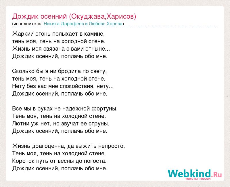Жаркий огонь полыхает в камине, тень моя, тень на холодной стене. Жизнь моя связана с вами отныне... Дождик осенний, поплачь обо мне. Сколько бы я ни бродила по свету, тень моя, тень на холодной стене. Нету без вас мне спокойствия, нету... Дождик осенний, поплачь обо мне. Все мы в руках не надежной фортуны. Тень моя, тень на холодной стене. Лютни уж нет, но звучат ее струны. Дождик осенний, поплачь обо мне. Жизнь драгоценна, да выжить непросто. Тень моя, тень на холодной стене. Короток путь от весны до погоста. Дождик осенний, поплачь обо мне.