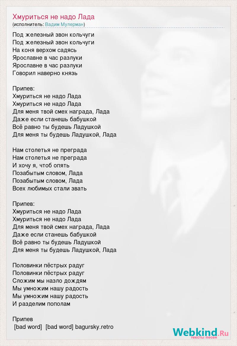 Под железный звон кольчуги Под железный звон кольчуги На коня верхом садясь Ярославне в час разлуки Ярославне в час разлуки Говорил наверно князь Припев: Хмуриться не надо Лада Хмуриться не надо Лада Для меня твой смех награда, Лада Даже если станешь бабушкой Всё равно ты будешь Ладушкой Для меня ты будешь Ладушкой, Лада Нам столетья не преграда Нам столетья не преграда И хочу я, чтоб опять Позабытым словом, Лада Позабытым словом, Лада Всех любимых стали звать Припев: Хмуриться не надо Лада Хмуриться не надо Лада Для меня твой смех награда, Лада Даже если станешь бабушкой Всё равно ты будешь Ладушкой Для меня ты будешь Ладушкой, Лада Половинки пёстрых радуг Половинки пёстрых радуг Сложим мы назло дождям Мы умножим нашу радость Мы умножим нашу радость И разделим пополам Припев [bad word] [bad word] bagursky.retro