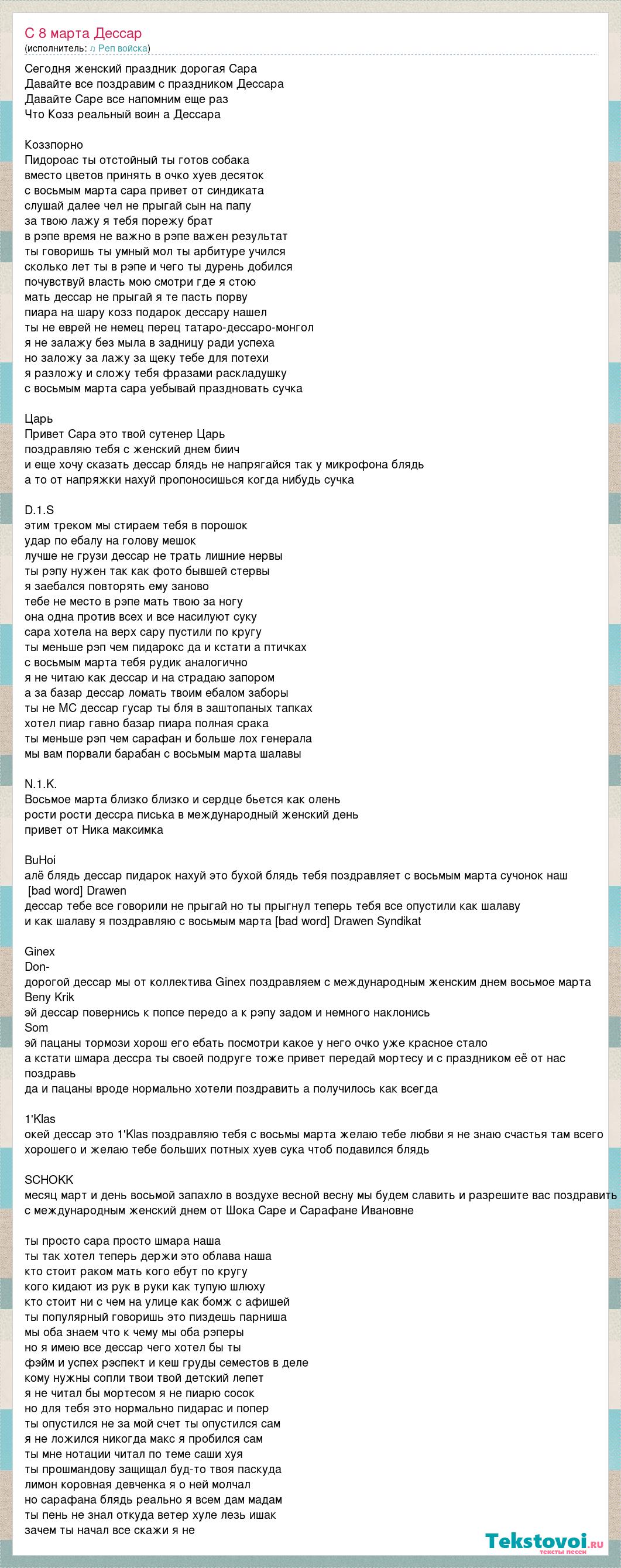 Сегодня женский праздник дорогая Сара Давайте все поздравим с праздником Дессара Давайте Саре все напомним еще раз Что Козз реальный воин а Дессара Коззпорно Пидороас ты отстойный ты готов собака вместо цветов принять в очко хуев десяток с восьмым марта сара привет от синдиката слушай далее чел не прыгай сын на папу за твою лажу я тебя порежу брат в рэпе время не важно в рэпе важен результат ты говоришь ты умный мол ты арбитуре учился сколько лет ты в рэпе и чего ты дурень добился почувствуй власть мою смотри где я стою мать дессар не прыгай я те пасть порву пиара на шару козз подарок дессару нашел ты не еврей не немец перец татаро-дессаро-монгол я не залажу без мыла в задницу ради успеха но заложу за лажу за щеку тебе для потехи я разложу и сложу тебя фразами раскладушку с восьмым марта сара уебывай праздновать сучка Царь Привет Сара это твой сутенер Царь поздравляю тебя с женский днем биич и еще хочу сказать дессар блядь не напрягайся так у микрофона блядь а то от напряжки нахуй пропоносишься когда нибудь сучка D.1.S этим треком мы стираем тебя в порошок удар по ебалу на голову мешок лучше не грузи дессар не трать лишние нервы ты рэпу нужен так как фото бывшей стервы я заебался повторять ему заново тебе не место в рэпе мать твою за ногу она одна против всех и все насилуют суку сара хотела на верх сару пустили по кругу ты меньше рэп чем пидарокс да и кстати а птичках с восьмым марта тебя рудик аналогично я не читаю как дессар и на страдаю запором а за базар дессар ломать твоим ебалом заборы ты не МС дессар гусар ты бля в заштопаных тапках хотел пиар гавно базар пиара полная срака ты меньше рэп чем сарафан и больше лох генерала мы вам порвали барабан с восьмым марта шалавы N.1.K. Восьмое марта близко близко и сердце бьется как олень рости рости дессра писька в международный женский день привет от Ника максимка BuHoi алё блядь дессар пидарок нахуй это бухой блядь тебя поздравляет с восьмым марта сучонок наш [bad word] Drawen дессар тебе все говорили не прыгай но ты прыгнул теперь тебя все опустили как шалаву и как шалаву я поздравляю с восьмым марта [bad word] Drawen Syndikat Ginex Don- дорогой дессар мы от коллектива Ginex поздравляем с международным женским днем восьмое марта Beny Krik эй дессар повернись к попсе передо а к рэпу задом и немного наклонись Som эй пацаны тормози хорош его ебать посмотри какое у него очко уже красное стало а кстати шмара дессра ты своей подруге тоже привет передай мортесу и с праздником её от нас поздравь да и пацаны вроде нормально хотели поздравить а получилось как всегда 1'Klas окей дессар это 1'Klas поздравляю тебя с восьмы марта желаю тебе любви я не знаю счастья там всего хорошего и желаю тебе больших потных хуев сука чтоб подавился блядь SCHOKK месяц март и день восьмой запахло в воздухе весной весну мы будем славить и разрешите вас поздравить с международным женский днем от Шока Саре и Сарафане Ивановне ты просто сара просто шмара наша ты так хотел теперь держи это облава наша кто стоит раком мать кого ебут по кругу кого кидают из рук в руки как тупую шлюху кто стоит ни с чем на улице как бомж с афишей ты популярный говоришь это пиздешь парниша мы оба знаем что к чему мы оба рэперы но я имею все дессар чего хотел бы ты фэйм и успех рэспект и кеш груды семестов в деле кому нужны сопли твои твой детский лепет я не читал бы мортесом я не пиарю сосок но д