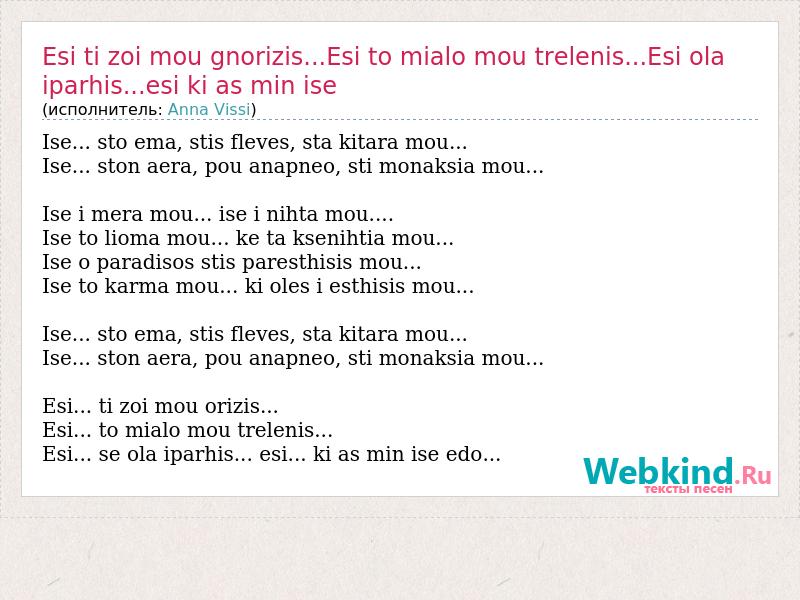 Ise... sto ema, stis fleves, sta kitara mou... Ise... ston aera, pou anapneo, sti monaksia mou... Ise i mera mou... ise i nihta mou.... Ise to lioma mou... ke ta ksenihtia mou... Ise o paradisos stis paresthisis mou... Ise to karma mou... ki oles i esthisis mou... Ise... sto ema, stis fleves, sta kitara mou... Ise... ston aera, pou anapneo, sti monaksia mou... Esi... ti zoi mou orizis... Esi... to mialo mou trelenis... Esi... se ola iparhis... esi... ki as min ise edo...