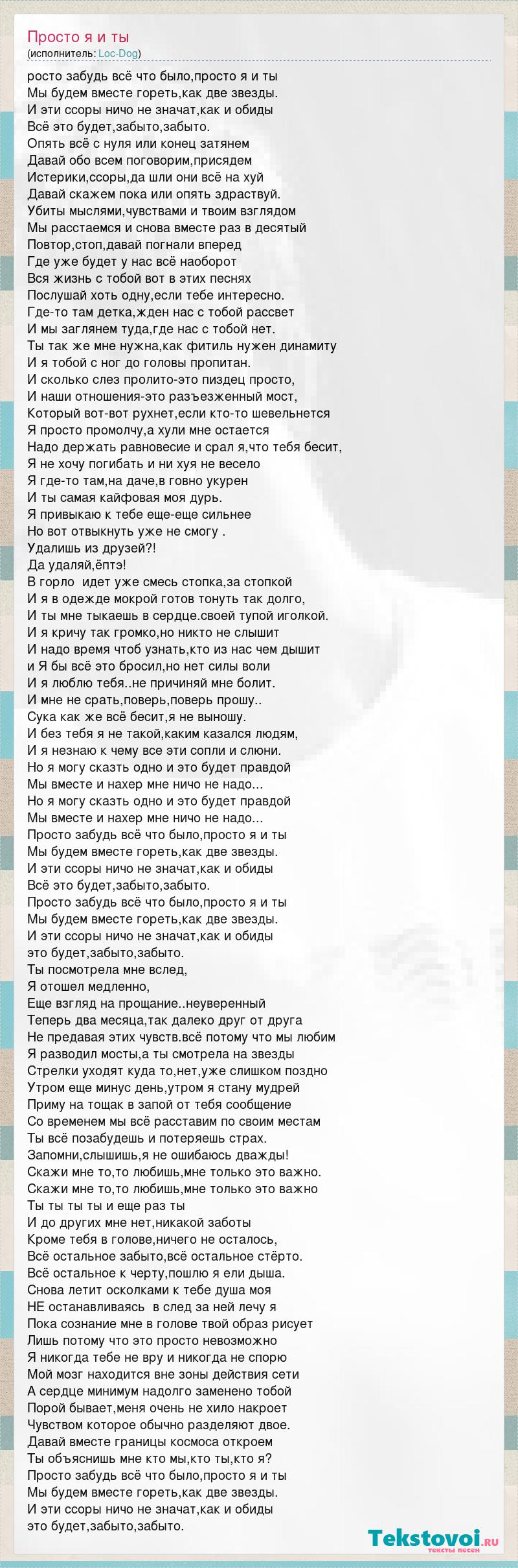 росто забудь всё что было,просто я и ты Мы будем вместе гореть,как две звезды. И эти ссоры ничо не значат,как и обиды Всё это будет,забыто,забыто. Опять всё с нуля или конец затянем Давай обо всем поговорим,присядем Истерики,ссоры,да шли они всё на хуй Давай скажем пока или опять здраствуй. Убиты мыслями,чувствами и твоим взглядом Мы расстаемся и снова вместе раз в десятый Повтор,стоп,давай погнали вперед Где уже будет у нас всё наоборот Вся жизнь с тобой вот в этих песнях Послушай хоть одну,если тебе интересно. Где-то там детка,жден нас с тобой рассвет И мы заглянем туда,где нас с тобой нет. Ты так же мне нужна,как фитиль нужен динамиту И я тобой с ног до головы пропитан. И сколько слез пролито-это пиздец просто, И наши отношения-это разъезженный мост, Который вот-вот рухнет,если кто-то шевельнется Я просто промолчу,а хули мне остается Надо держать равновесие и срал я,что тебя бесит, Я не хочу погибать и ни хуя не весело Я где-то там,на даче,в говно укурен И ты самая кайфовая моя дурь. Я привыкаю к тебе еще-еще сильнее Но вот отвыкнуть уже не смогу . Удалишь из друзей?! Да удаляй,ёптэ! В горло идет уже смесь стопка,за стопкой И я в одежде мокрой готов тонуть так долго, И ты мне тыкаешь в сердце.своей тупой иголкой. И я кричу так громко,но никто не слышит И надо время чтоб узнать,кто из нас чем дышит и Я бы всё это бросил,но нет силы воли И я люблю тебя..не причиняй мне болит. И мне не срать,поверь,поверь прошу.. Сука как же всё бесит,я не выношу. И без тебя я не такой,каким казался людям, И я незнаю к чему все эти сопли и слюни. Но я могу сказть одно и это будет правдой Мы вместе и нахер мне ничо не надо... Но я могу сказть одно и это будет правдой Мы вместе и нахер мне ничо не надо... Просто забудь всё что было,просто я и ты Мы будем вместе гореть,как две звезды. И эти ссоры ничо не значат,как и обиды Всё это будет,забыто,забыто. Просто забудь всё что было,просто я и ты Мы будем вместе гореть,как две звезды. И эти ссоры ничо не значат,как и обиды это будет,забыто,забыто. Ты посмотрела мне вслед, Я отошел медленно, Еще взгляд на прощание..неуверенный Теперь два месяца,так далеко друг от друга Не предавая этих чувств.всё потому что мы любим Я разводил мосты,а ты смотрела на звезды Стрелки уходят куда то,нет,уже слишком поздно Утром еще минус день,утром я стану мудрей Приму на тощак в запой от тебя сообщение Со временем мы всё расставим по своим местам Ты всё позабудешь и потеряешь страх. Запомни,слышишь,я не ошибаюсь дважды! Скажи мне то,то любишь,мне только это важно. Скажи мне то,то любишь,мне только это важно Ты ты ты ты и еще раз ты И до других мне нет,никакой заботы Кроме тебя в голове,ничего не осталось, Всё остальное забыто,всё остальное стёрто. Всё остальное к черту,пошлю я ели дыша. Снова летит осколками к тебе душа моя НЕ останавливаясь в след за ней лечу я Пока сознание мне в голове твой образ рисует Лишь потому что это просто невозможно Я никогда тебе не вру и никогда не спорю Мой мозг находится вне зоны действия сети А сердце минимум надолго заменено тобой Порой бывает,меня очень не хило накроет Чувством которое обычно разделяют двое. Давай вместе границы космоса откроем Ты объяснишь мне кто мы,кто ты,кто я? Просто забудь всё что было,просто я и ты Мы будем вместе гореть,как две звезды. И эти ссоры ничо не значат,как и обиды это будет,забыто,забыто.