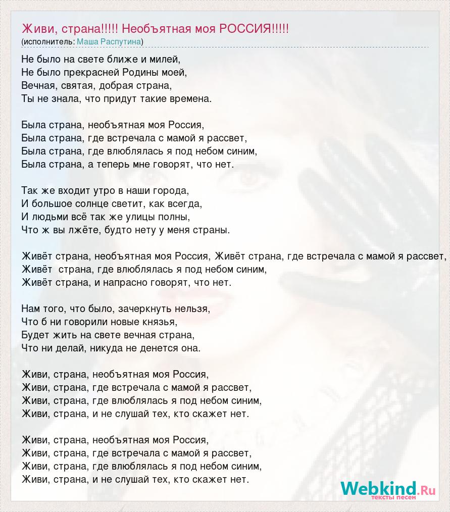 Не было на свете ближе и милей, Не было прекрасней Родины моей, Вечная, святая, добрая страна, Ты не знала, что придут такие времена. Была страна, необъятная моя Россия, Была страна, где встречала с мамой я рассвет, Была страна, где влюблялась я под небом синим, Была страна, а теперь мне говорят, что нет. Так же входит утро в наши города, И большое солнце светит, как всегда, И людьми всё так же улицы полны, Что ж вы лжёте, будто нету у меня страны. Живёт страна, необъятная моя Россия, Живёт страна, где встречала с мамой я рассвет, Живёт страна, где влюблялась я под небом синим, Живёт страна, и напрасно говорят, что нет. Нам того, что было, зачеркнуть нельзя, Что б ни говорили новые князья, Будет жить на свете вечная страна, Что ни делай, никуда не денется она. Живи, страна, необъятная моя Россия, Живи, страна, где встречала с мамой я рассвет, Живи, страна, где влюблялась я под небом синим, Живи, страна, и не слушай тех, кто скажет нет. Живи, страна, необъятная моя Россия, Живи, страна, где встречала с мамой я рассвет, Живи, страна, где влюблялась я под небом синим, Живи, страна, и не слушай тех, кто скажет нет.