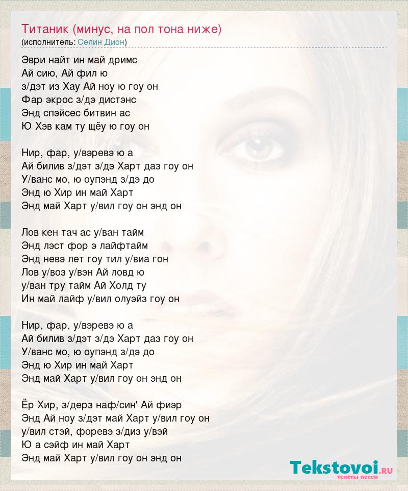 Эври найт ин май дримс Ай сию, Ай фил ю з/дэт из Хау Ай ноу ю гоу он Фар экрос з/дэ дистэнс Энд спэйсес битвин ас Ю Хэв кам ту щёу ю гоу он Нир, фар, у/вэревэ ю а Ай билив з/дэт з/дэ Харт даз гоу он У/ванс мо, ю оупэнд з/дэ до Энд ю Хир ин май Харт Энд май Харт у/вил гоу он энд он Лов кен тач ас у/ван тайм Энд лэст фор э лайфтайм Энд невэ лет гоу тил у/виа гон Лов у/воз у/вэн Ай ловд ю у/ван тру тайм Ай Холд ту Ин май лайф у/вил олуэйз гоу он Нир, фар, у/вэревэ ю а Ай билив з/дэт з/дэ Харт даз гоу он У/ванс мо, ю оупэнд з/дэ до Энд ю Хир ин май Харт Энд май Харт у/вил гоу он энд он Ёр Хир, з/дерз наф/син' Ай фиэр Энд Ай ноу з/дэт май Харт у/вил гоу он у/вил стэй, форевэ з/диз у/вэй Ю а сэйф ин май Харт Энд май Харт у/вил гоу он энд он