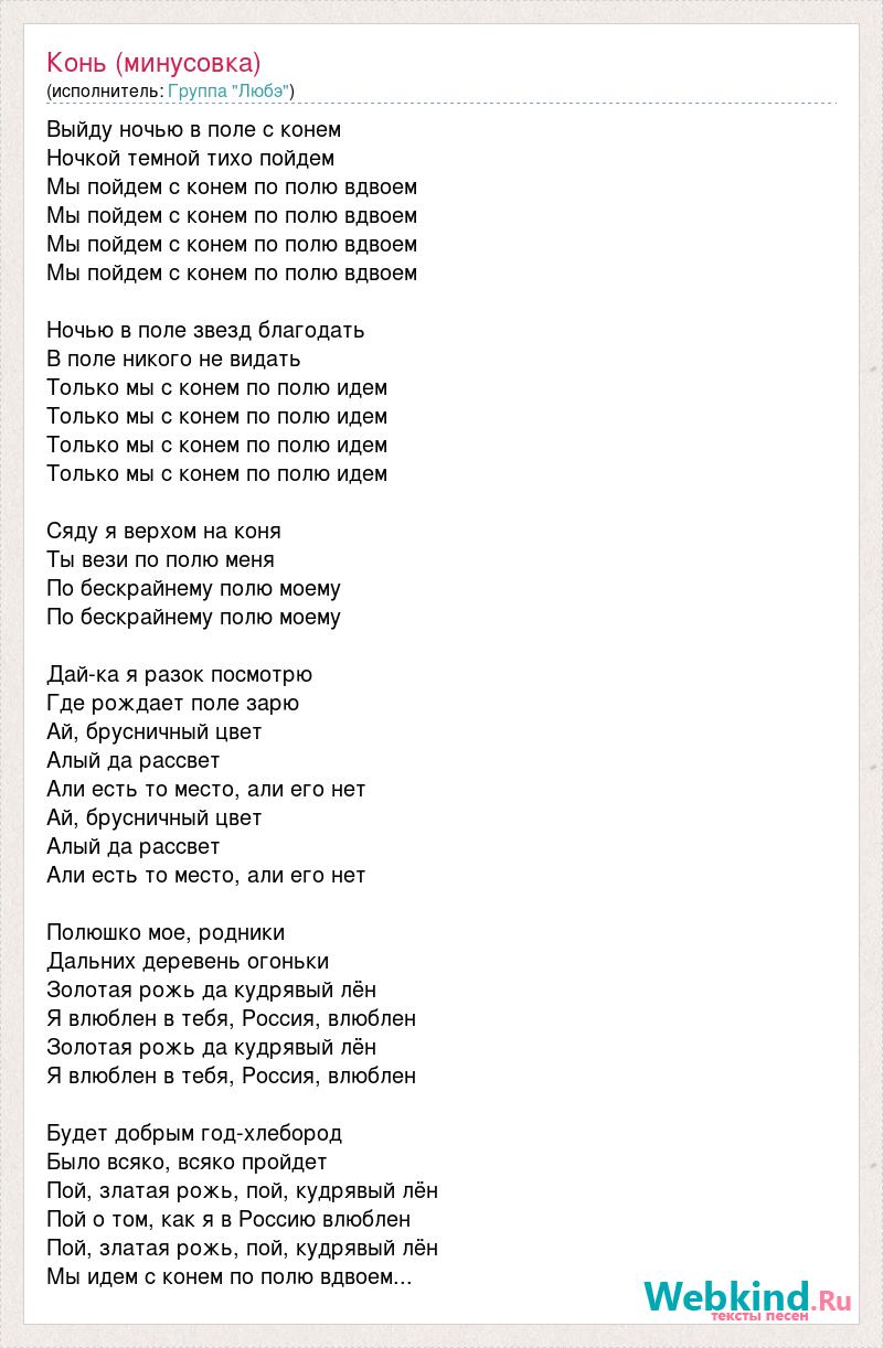 Выйду ночью в поле с конем Ночкой темной тихо пойдем Мы пойдем с конем по полю вдвоем Мы пойдем с конем по полю вдвоем Мы пойдем с конем по полю вдвоем Мы пойдем с конем по полю вдвоем Ночью в поле звезд благодать В поле никого не видать Только мы с конем по полю идем Только мы с конем по полю идем Только мы с конем по полю идем Только мы с конем по полю идем Сяду я верхом на коня Ты вези по полю меня По бескрайнему полю моему По бескрайнему полю моему Дай-ка я разок посмотрю Где рождает поле зарю Ай, брусничный цвет Алый да рассвет Али есть то место, али его нет Ай, брусничный цвет Алый да рассвет Али есть то место, али его нет Полюшко мое, родники Дальних деревень огоньки Золотая рожь да кудрявый лён Я влюблен в тебя, Россия, влюблен Золотая рожь да кудрявый лён Я влюблен в тебя, Россия, влюблен Будет добрым год-хлебород Было всяко, всяко пройдет Пой, златая рожь, пой, кудрявый лён Пой о том, как я в Россию влюблен Пой, златая рожь, пой, кудрявый лён Мы идем с конем по полю вдвоем...
