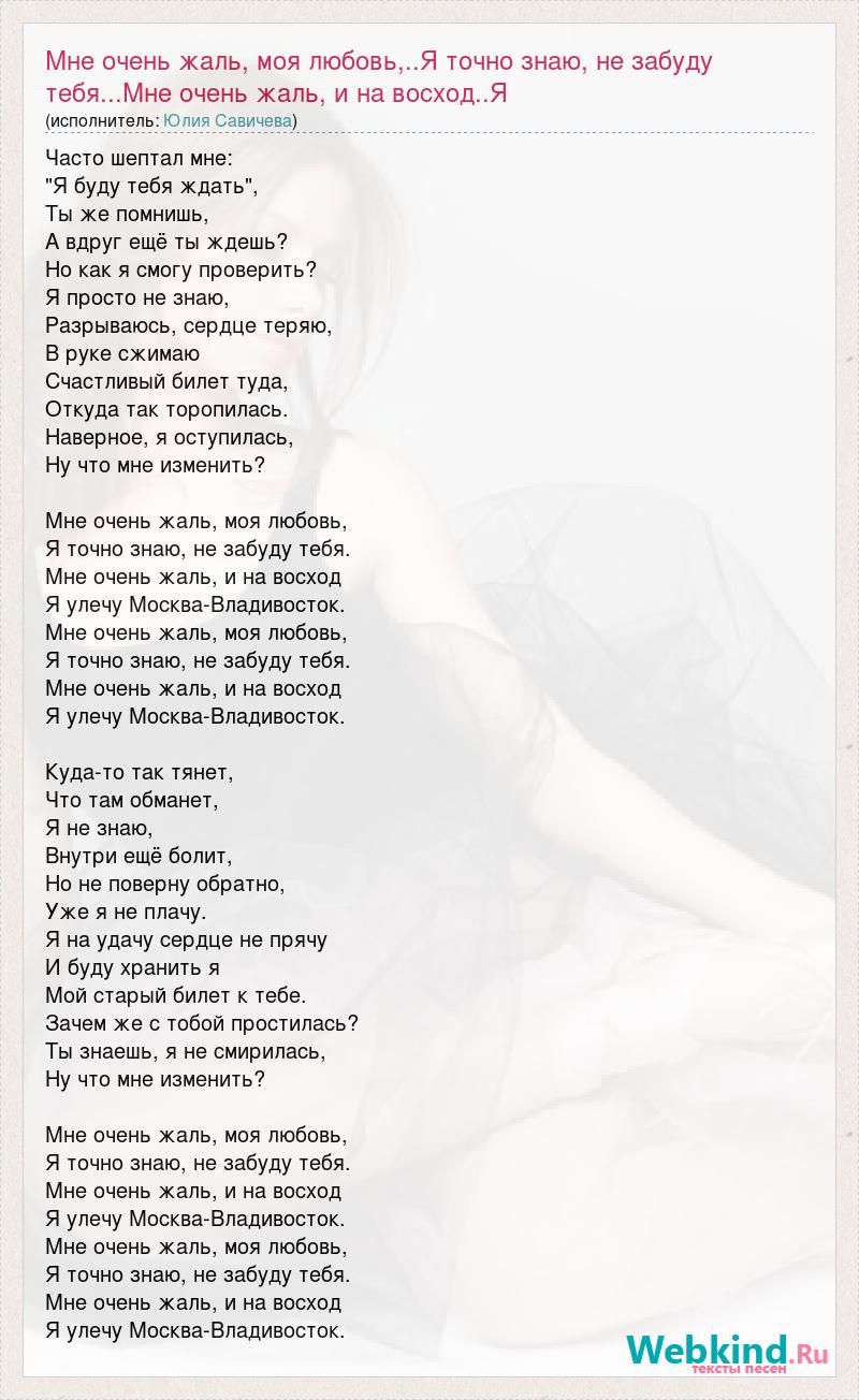 Главная→Исполнители→Юлия Савичева→Мне очень жаль, моя любовь,..Я точно знаю, не забуду тебя...Мне очень жал