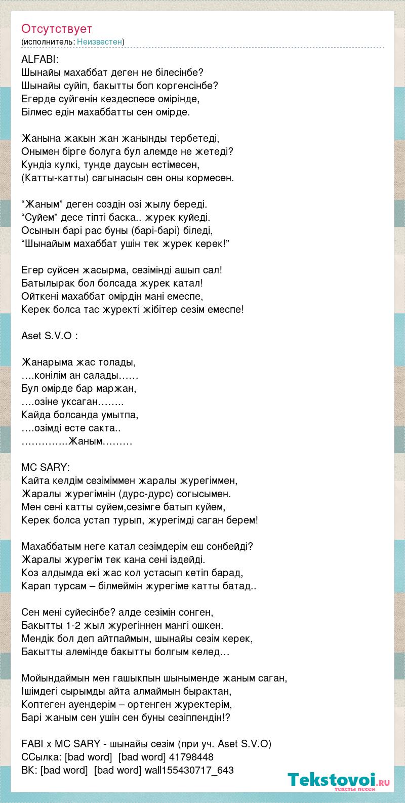 ALFABI: Шынайы махаббат деген не білесінбе? Шынайы суйіп, бакытты боп коргенсінбе? Егерде суйгенін кездеспесе омірінде, Білмес едін махаббатты сен омірде. Жанына жакын жан жанынды тербетеді, Онымен бірге болуга бул алемде не жетеді? Кундіз кулкі, тунде даусын естімесен, (Катты-катты) сагынасын сен оны кормесен. “Жаным” деген создін озі жылу береді. “Суйем” десе тіпті баска.. журек куйеді. Осынын барі рас буны (барі-барі) біледі, “Шынайым махаббат ушін тек журек керек!” Егер суйсен жасырма, сезімінді ашып сал! Батылырак бол болсада журек катал! Ойткені махаббат омірдін мані емеспе, Керек болса тас журекті жібітер сезім емеспе! Aset S.V.O : Жанарыма жас толады, ….конілім ан салады…… Бул омірде бар маржан, ….озіне уксаган…….. Кайда болсанда умытпа, ….озімді есте сакта.. …………..Жаным……… MC SARY: Кайта келдім сезіміммен жаралы журегіммен, Жаралы журегімнін (дурс-дурс) согысымен. Мен сені катты суйем,сезімге батып куйем, Керек болса устап турып, журегімді саган берем! Махаббатым неге катал сезімдерім еш сонбейді? Жаралы журегім тек кана сені іздейді. Коз алдымда екі жас кол устасып кетіп барад, Карап турсам – білмеймін журегіме катты батад.. Сен мені суйесінбе? алде сезімін сонген, Бакытты 1-2 жыл журегіннен мангі ошкен. Мендік бол деп айтпаймын, шынайы сезім керек, Бакытты алемінде бакытты болгым келед… Мойындаймын мен гашыкпын шыныменде жаным саган, Ішімдегі сырымды айта алмаймын бырактан, Коптеген ауендерім – ортенген журектерім, Барі жаным сен ушін сен буны сезіппендін!? FABI x MC SARY - шынайы сезім (при уч. Aset S.V.O) CCылка: [bad word] [bad word] 41798448 ВК: [bad word] [bad word] wall155430717_643