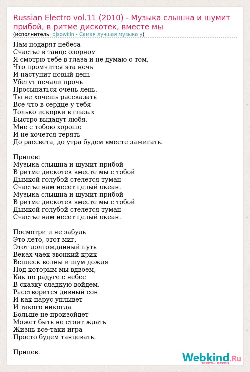 Нам подарят небеса Счастье в танце озорном Я смотрю тебе в глаза и не думаю о том, Что промчится эта ночь И наступит новый день Убегут печали прочь Просыпаться очень лень. Ты не хочешь рассказать Все что в сердце у тебя Только искорки в глазах Быстро выдадут любя. Мне с тобою хорошо И не хочется терять До рассвета, до утра будем вместе зажигать. Припев: Музыка слышна и шумит прибой В ритме дискотек вместе мы с тобой Дымкой голубой стелется туман Счастье нам несет целый океан. Музыка слышна и шумит прибой В ритме дискотек вместе мы с тобой Дымкой голубой стелется туман Счастье нам несет целый океан. Посмотри и не забудь Это лето, этот миг, Этот долгожданный путь Веках чаек звонкий крик Всплеск волны и шум дождя Под которым мы вдвоем, Как по радуге с небес В сказку сладкую войдем. Расстворится дивный сон И как парус уплывет И такого никогда Больше не произойдет Может быть не стоит ждать Жизнь все-таки игра Просто будем танцевать. Припев.