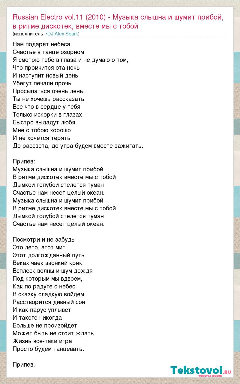 Нам подарят небеса Счастье в танце озорном Я смотрю тебе в глаза и не думаю о том, Что промчится эта ночь И наступит новый день Убегут печали прочь Просыпаться очень лень. Ты не хочешь рассказать Все что в сердце у тебя Только искорки в глазах Быстро выдадут любя. Мне с тобою хорошо И не хочется терять До рассвета, до утра будем вместе зажигать. Припев: Музыка слышна и шумит прибой В ритме дискотек вместе мы с тобой Дымкой голубой стелется туман Счастье нам несет целый океан. Музыка слышна и шумит прибой В ритме дискотек вместе мы с тобой Дымкой голубой стелется туман Счастье нам несет целый океан. Посмотри и не забудь Это лето, этот миг, Этот долгожданный путь Веках чаек звонкий крик Всплеск волны и шум дождя Под которым мы вдвоем, Как по радуге с небес В сказку сладкую войдем. Расстворится дивный сон И как парус уплывет И такого никогда Больше не произойдет Может быть не стоит ждать Жизнь все-таки игра Просто будем танцевать. Припев.