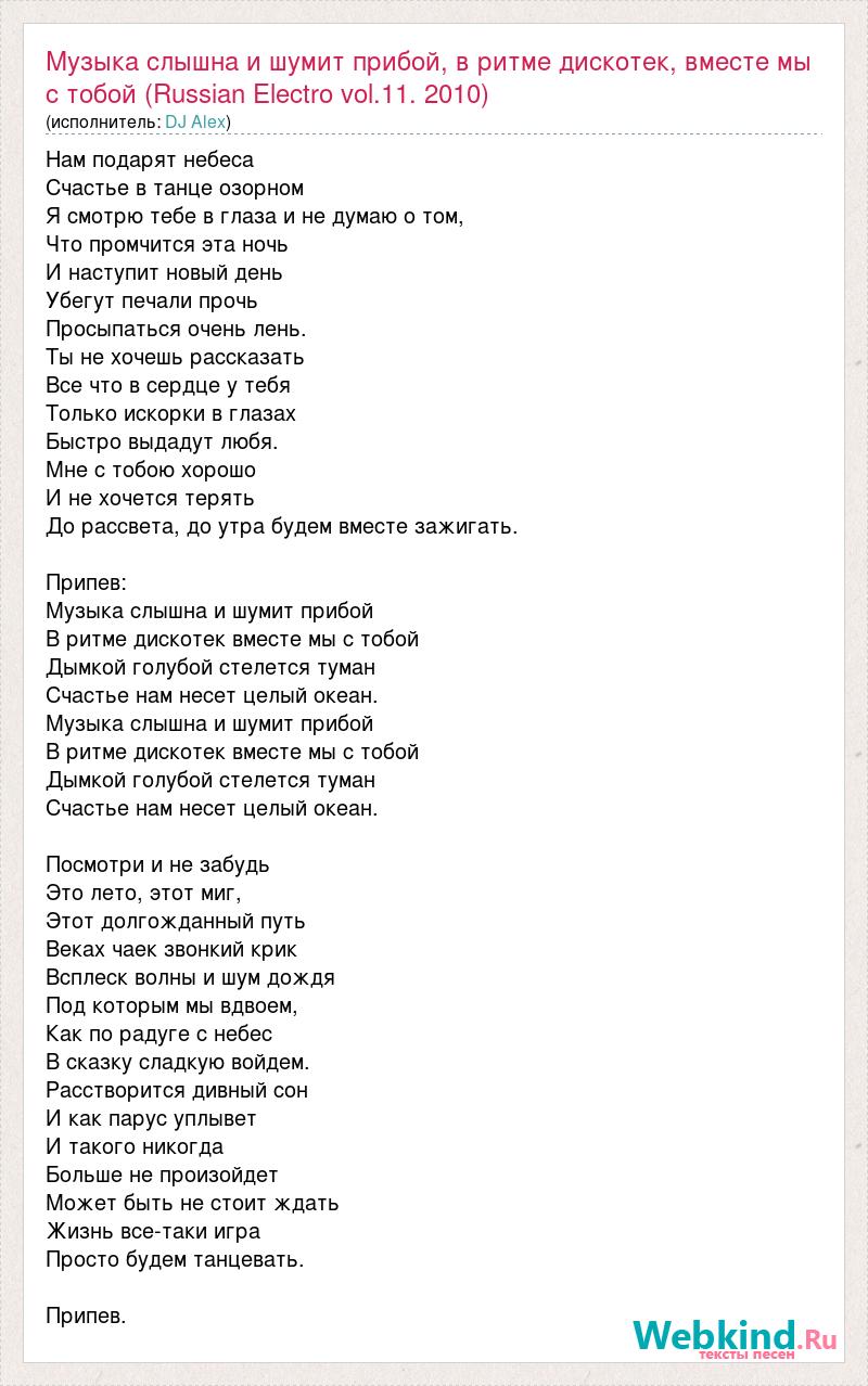 Нам подарят небеса Счастье в танце озорном Я смотрю тебе в глаза и не думаю о том, Что промчится эта ночь И наступит новый день Убегут печали прочь Просыпаться очень лень. Ты не хочешь рассказать Все что в сердце у тебя Только искорки в глазах Быстро выдадут любя. Мне с тобою хорошо И не хочется терять До рассвета, до утра будем вместе зажигать. Припев: Музыка слышна и шумит прибой В ритме дискотек вместе мы с тобой Дымкой голубой стелется туман Счастье нам несет целый океан. Музыка слышна и шумит прибой В ритме дискотек вместе мы с тобой Дымкой голубой стелется туман Счастье нам несет целый океан. Посмотри и не забудь Это лето, этот миг, Этот долгожданный путь Веках чаек звонкий крик Всплеск волны и шум дождя Под которым мы вдвоем, Как по радуге с небес В сказку сладкую войдем. Расстворится дивный сон И как парус уплывет И такого никогда Больше не произойдет Может быть не стоит ждать Жизнь все-таки игра Просто будем танцевать. Припев.