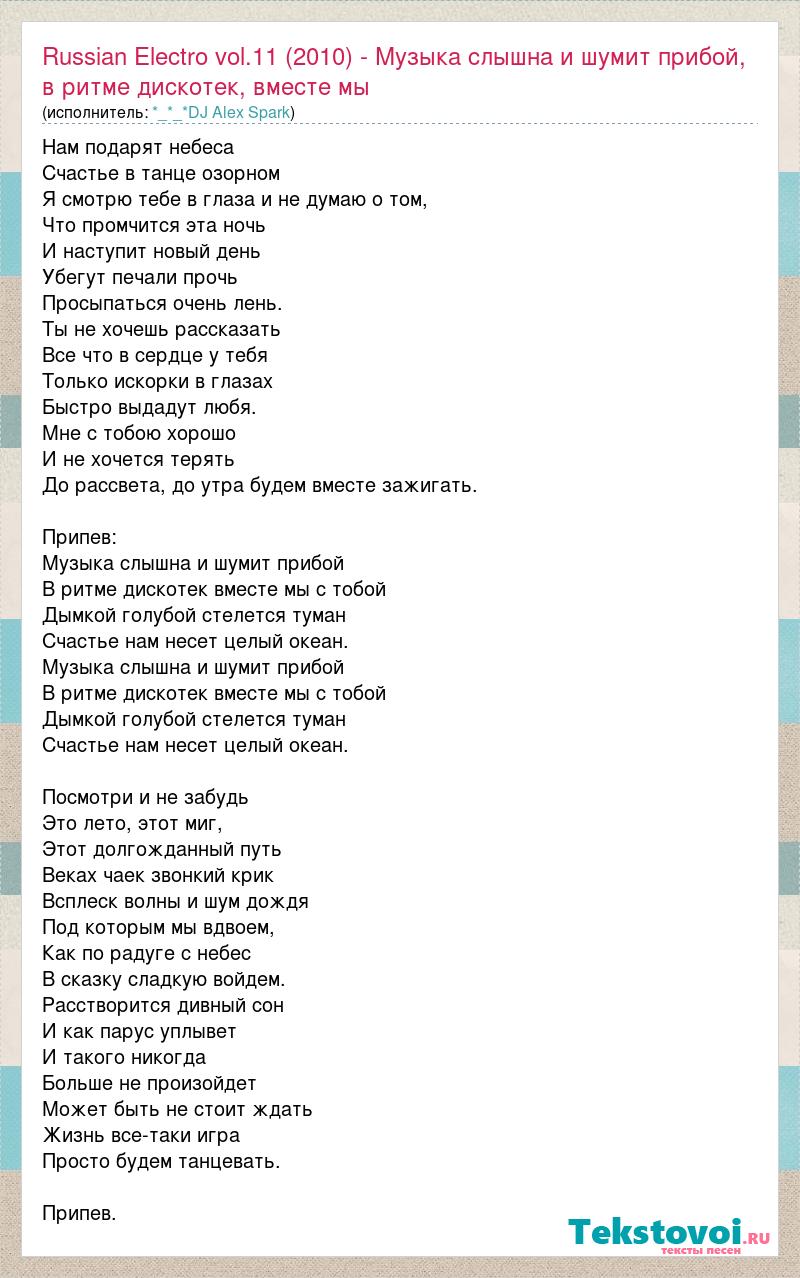 Нам подарят небеса Счастье в танце озорном Я смотрю тебе в глаза и не думаю о том, Что промчится эта ночь И наступит новый день Убегут печали прочь Просыпаться очень лень. Ты не хочешь рассказать Все что в сердце у тебя Только искорки в глазах Быстро выдадут любя. Мне с тобою хорошо И не хочется терять До рассвета, до утра будем вместе зажигать. Припев: Музыка слышна и шумит прибой В ритме дискотек вместе мы с тобой Дымкой голубой стелется туман Счастье нам несет целый океан. Музыка слышна и шумит прибой В ритме дискотек вместе мы с тобой Дымкой голубой стелется туман Счастье нам несет целый океан. Посмотри и не забудь Это лето, этот миг, Этот долгожданный путь Веках чаек звонкий крик Всплеск волны и шум дождя Под которым мы вдвоем, Как по радуге с небес В сказку сладкую войдем. Расстворится дивный сон И как парус уплывет И такого никогда Больше не произойдет Может быть не стоит ждать Жизнь все-таки игра Просто будем танцевать. Припев.