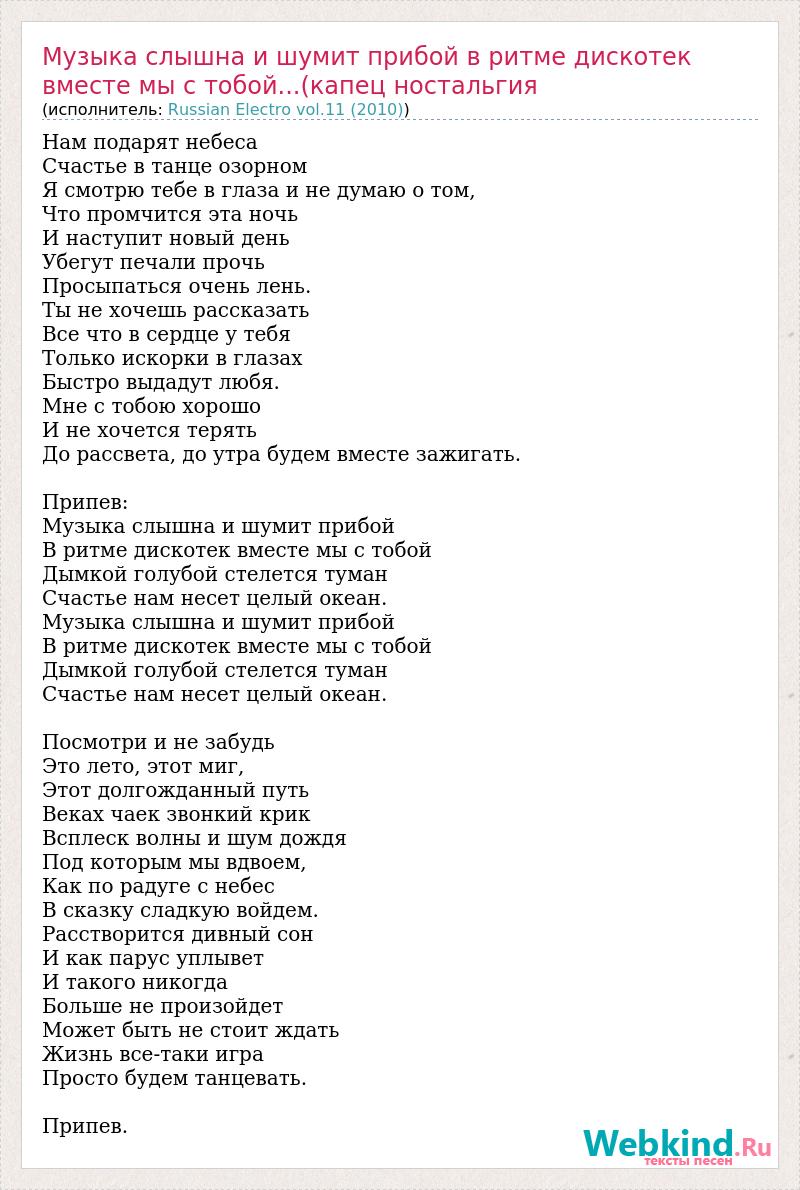 Нам подарят небеса Счастье в танце озорном Я смотрю тебе в глаза и не думаю о том, Что промчится эта ночь И наступит новый день Убегут печали прочь Просыпаться очень лень. Ты не хочешь рассказать Все что в сердце у тебя Только искорки в глазах Быстро выдадут любя. Мне с тобою хорошо И не хочется терять До рассвета, до утра будем вместе зажигать. Припев: Музыка слышна и шумит прибой В ритме дискотек вместе мы с тобой Дымкой голубой стелется туман Счастье нам несет целый океан. Музыка слышна и шумит прибой В ритме дискотек вместе мы с тобой Дымкой голубой стелется туман Счастье нам несет целый океан. Посмотри и не забудь Это лето, этот миг, Этот долгожданный путь Веках чаек звонкий крик Всплеск волны и шум дождя Под которым мы вдвоем, Как по радуге с небес В сказку сладкую войдем. Расстворится дивный сон И как парус уплывет И такого никогда Больше не произойдет Может быть не стоит ждать Жизнь все-таки игра Просто будем танцевать. Припев.
