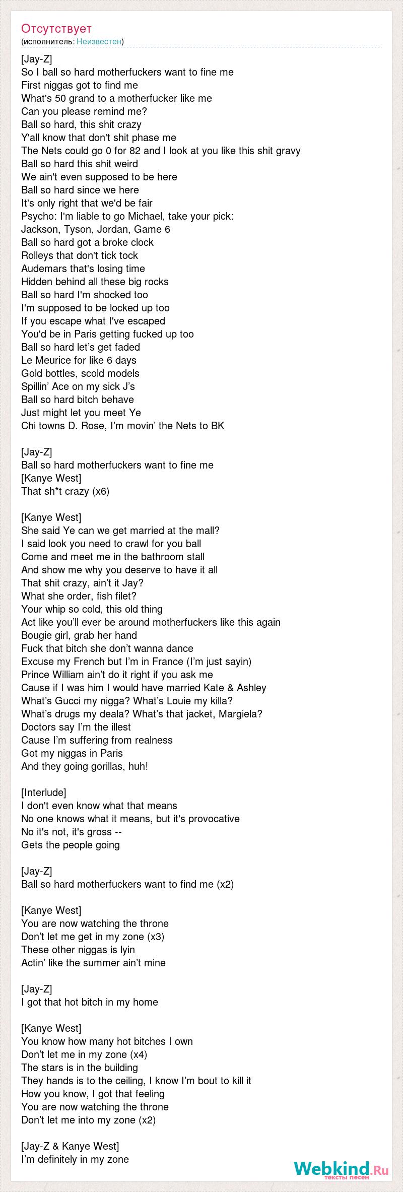 [Jay-Z] So I ball so hard motherfuckers want to fine me First niggas got to find me What's 50 grand to a motherfucker like me Can you please remind me? Ball so hard, this shit crazy Y'all know that don't shit phase me The Nets could go 0 for 82 and I look at you like this shit gravy Ball so hard this shit weird We ain't even supposed to be here Ball so hard since we here It's only right that we'd be fair Psycho: I'm liable to go Michael, take your pick: Jackson, Tyson, Jordan, Game 6 Ball so hard got a broke clock Rolleys that don't tick tock Audemars that's losing time Hidden behind all these big rocks Ball so hard I'm shocked too I'm supposed to be locked up too If you escape what I've escaped You'd be in Paris getting fucked up too Ball so hard let’s get faded Le Meurice for like 6 days Gold bottles, scold models Spillin’ Ace on my sick J’s Ball so hard bitch behave Just might let you meet Ye Chi towns D. Rose, I’m movin’ the Nets to BK [Jay-Z] Ball so hard motherfuckers want to fine me [Kanye West] That sh*t crazy (x6) [Kanye West] She said Ye can we get married at the mall? I said look you need to crawl for you ball Come and meet me in the bathroom stall And show me why you deserve to have it all That shit crazy, ain’t it Jay? What she order, fish filet? Your whip so cold, this old thing Act like you’ll ever be around motherfuckers like this again Bougie girl, grab her hand Fuck that bitch she don’t wanna dance Excuse my French but I’m in France (I’m just sayin) Prince William ain’t do it right if you ask me Cause if I was him I would have married Kate & Ashley What’s Gucci my nigga? What’s Louie my killa? What’s drugs my deala? What’s that jacket, Margiela? Doctors say I’m the illest Cause I’m suffering from realness Got my niggas in Paris And they going gorillas, huh! [Interlude] I don't even know what that means No one knows what it means, but it's provocative No it's not, it's gross -- Gets the people going [Jay-Z] Ball so hard motherfuckers want to find me (x2) [Kanye West] You are now watching the throne Don’t let me get in my zone (x3) These other niggas is lyin Actin’ like the summer ain’t mine [Jay-Z] I got that hot bitch in my home [Kanye West] You know how many hot bitches I own Don’t let me in my zone (x4) The stars is in the building They hands is to the ceiling, I know I’m bout to kill it How you know, I got that feeling You are now watching the throne Don’t let me into my zone (x2) [Jay-Z & Kanye West] I’m definitely in my zone