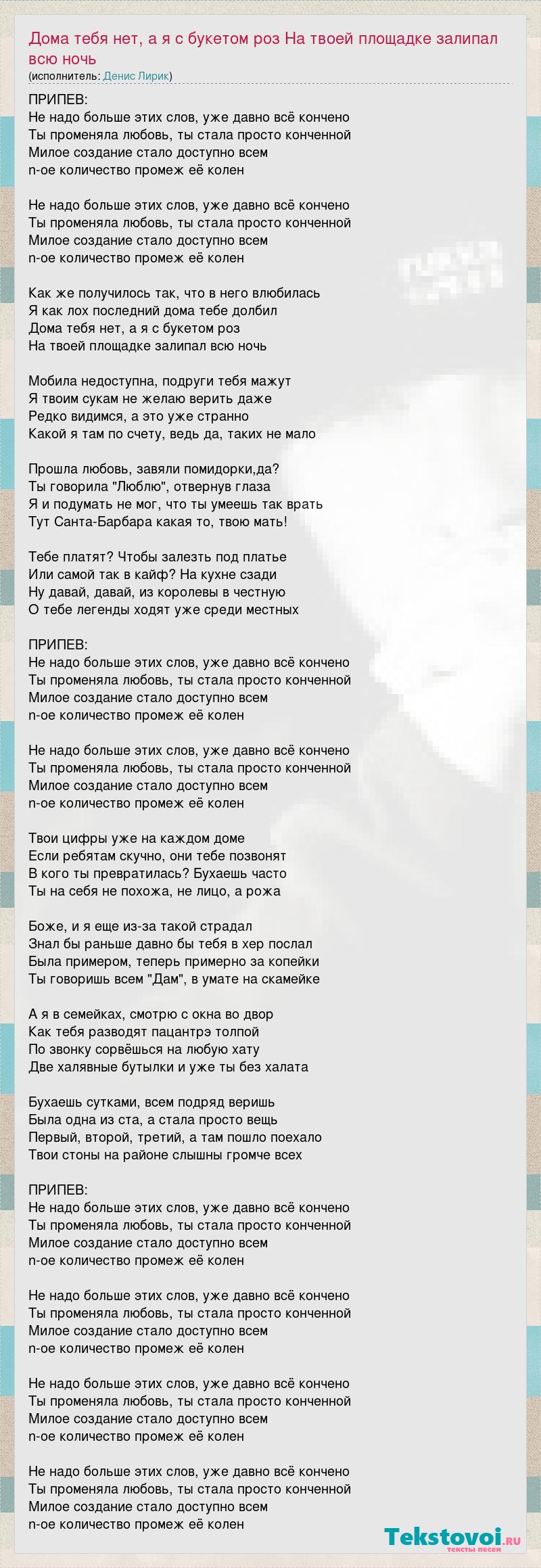 ПРИПЕВ: Не надо больше этих слов, уже давно всё кончено Ты променяла любовь, ты стала просто конченной Милое создание стало доступно всем n-ое количество промеж её колен Не надо больше этих слов, уже давно всё кончено Ты променяла любовь, ты стала просто конченной Милое создание стало доступно всем n-ое количество промеж её колен Как же получилось так, что в него влюбилась Я как лох последний дома тебе долбил Дома тебя нет, а я с букетом роз На твоей площадке залипал всю ночь Мобила недоступна, подруги тебя мажут Я твоим сукам не желаю верить даже Редко видимся, а это уже странно Какой я там по счету, ведь да, таких не мало Прошла любовь, завяли помидорки,да? Ты говорила "Люблю", отвернув глаза Я и подумать не мог, что ты умеешь так врать Тут Санта-Барбара какая то, твою мать! Тебе платят? Чтобы залезть под платье Или самой так в кайф? На кухне сзади Ну давай, давай, из королевы в честную О тебе легенды ходят уже среди местных ПРИПЕВ: Не надо больше этих слов, уже давно всё кончено Ты променяла любовь, ты стала просто конченной Милое создание стало доступно всем n-ое количество промеж её колен Не надо больше этих слов, уже давно всё кончено Ты променяла любовь, ты стала просто конченной Милое создание стало доступно всем n-ое количество промеж её колен Твои цифры уже на каждом доме Если ребятам скучно, они тебе позвонят В кого ты превратилась? Бухаешь часто Ты на себя не похожа, не лицо, а рожа Боже, и я еще из-за такой страдал Знал бы раньше давно бы тебя в хер послал Была примером, теперь примерно за копейки Ты говоришь всем "Дам", в умате на скамейке А я в семейках, смотрю с окна во двор Как тебя разводят пацантрэ толпой По звонку сорвёшься на любую хату Две халявные бутылки и уже ты без халата Бухаешь сутками, всем подряд веришь Была одна из ста, а стала просто вещь Первый, второй, третий, а там пошло поехало Твои стоны на районе слышны громче всех ПРИПЕВ: Не надо больше этих слов, уже давно всё кончено Ты променяла любовь, ты стала просто конченной Милое создание стало доступно всем n-ое количество промеж её колен Не надо больше этих слов, уже давно всё кончено Ты променяла любовь, ты стала просто конченной Милое создание стало доступно всем n-ое количество промеж её колен Не надо больше этих слов, уже давно всё кончено Ты променяла любовь, ты стала просто конченной Милое создание стало доступно всем n-ое количество промеж её колен Не надо больше этих слов, уже давно всё кончено Ты променяла любовь, ты стала просто конченной Милое создание стало доступно всем n-ое количество промеж её колен