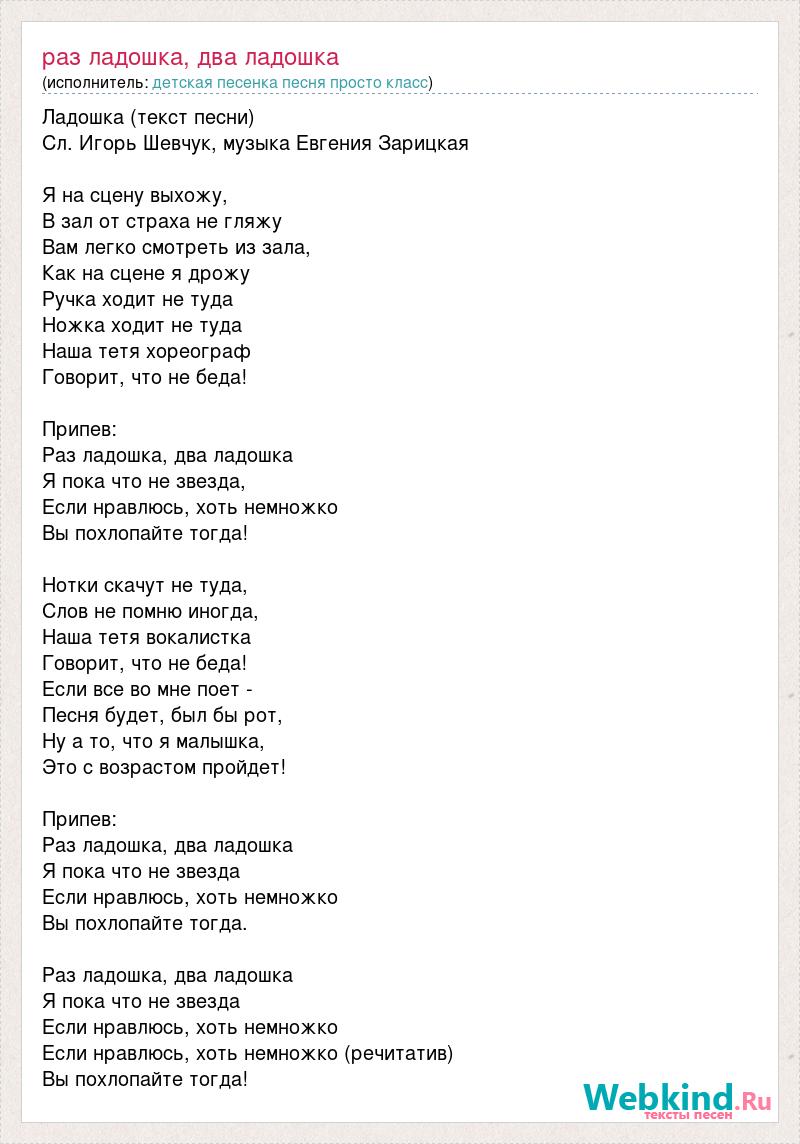 Ладошка (текст песни) Сл. Игорь Шевчук, музыка Евгения Зарицкая Я на сцену выхожу, В зал от страха не гляжу Вам легко смотреть из зала, Как на сцене я дрожу Ручка ходит не туда Ножка ходит не туда Наша тетя хореограф Говорит, что не беда! Припев: Раз ладошка, два ладошка Я пока что не звезда, Если нравлюсь, хоть немножко Вы похлопайте тогда! Нотки скачут не туда, Слов не помню иногда, Наша тетя вокалистка Говорит, что не беда! Если все во мне поет - Песня будет, был бы рот, Ну а то, что я малышка, Это с возрастом пройдет! Припев: Раз ладошка, два ладошка Я пока что не звезда Если нравлюсь, хоть немножко Вы похлопайте тогда. Раз ладошка, два ладошка Я пока что не звезда Если нравлюсь, хоть немножко Если нравлюсь, хоть немножко (речитатив) Вы похлопайте тогда!