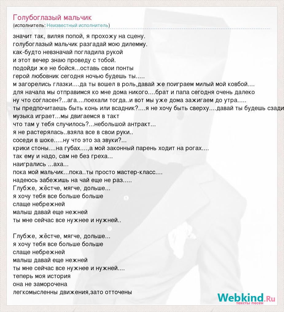 значит так, виляя попой, я прохожу на сцену. голубоглазый мальчик разгадай мою дилемму. как-будто невзначай погладила рукой и этот вечер знаю проведу с тобой. подойди же не бойся...оставь свои понты герой любовник сегодня ночью будешь ты..... м загорелись глазки....да ты вошел в роль,давай же поиграем милый мой ковбой.... для начала мы отправимся ко мне дома никого....брат и папа сегодня очень далеко ну что согласен?...ага....поехали тогда..и вот мы уже дома зажигаем до утра..... ты предпочитаешь быть конь или всадник?....я не хочу быть сверху....давай ты будешь сзади музыка играет...мы двигаемся в такт что там у тебя случилось?...небольшой антракт... я не растерялась..взяла все в свои руки.. соседи в шоке.....ну что это за звуки?... крики стоны....на губах....,а мой законный парень ходит на рогах.... так ему и надо, сам не без греха... наигрались ...аха... пока мой мальчик...пока..ты просто мастер-класс.... надеюсь забежишь на чай еще не раз..... Глубже, жёстче, мягче, дольше... я хочу тебя все больше больше слаще небрежней малыш давай еще нежней ты мне сейчас все нужнее и нужней.. Глубже, жёстче, мягче, дольше... я хочу тебя все больше больше слаще небрежней малыш давай еще нежней ты мне сейчас все нужнее и нужней.... теперь моя история она не заморочена легкомысленны движения,зато отточены