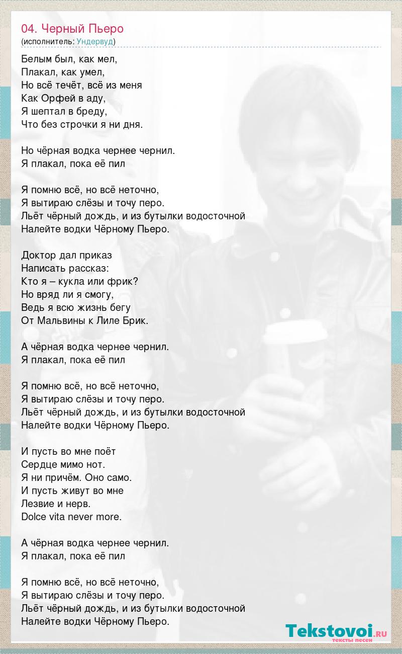 Белым был, как мел, Плакал, как умел, Но всё течёт, всё из меня Как Орфей в аду, Я шептал в бреду, Что без строчки я ни дня. Но чёрная водка чернее чернил. Я плакал, пока её пил Я помню всё, но всё неточно, Я вытираю слёзы и точу перо. Льёт чёрный дождь, и из бутылки водосточной Налейте водки Чёрному Пьеро. Доктор дал приказ Написать рассказ: Кто я – кукла или фрик? Но вряд ли я смогу, Ведь я всю жизнь бегу От Мальвины к Лиле Брик. А чёрная водка чернее чернил. Я плакал, пока её пил Я помню всё, но всё неточно, Я вытираю слёзы и точу перо. Льёт чёрный дождь, и из бутылки водосточной Налейте водки Чёрному Пьеро. И пусть во мне поёт Сердце мимо нот. Я ни причём. Оно само. И пусть живут во мне Лезвие и нерв. Dolce vita never more. А чёрная водка чернее чернил. Я плакал, пока её пил Я помню всё, но всё неточно, Я вытираю слёзы и точу перо. Льёт чёрный дождь, и из бутылки водосточной Налейте водки Чёрному Пьеро.