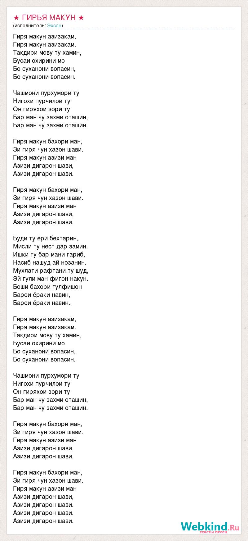 Гиря макун азизакам, Гиря макун азизакам. Такдири мову ту хамин, Бусаи охирини мо Бо суханони вопасин, Бо суханони вопасин. Чашмони пурхумори ту Нигохи пурчилои ту Он гиряхои зори ту Бар ман чу захми оташин, Бар ман чу захми оташин. Гиря макун бахори ман, Зи гиря чун хазон шави. Гиря макун азизи ман Азизи дигарон шави, Азизи дигарон шави. Гиря макун бахори ман, Зи гиря чун хазон шави. Гиря макун азизи ман Азизи дигарон шави, Азизи дигарон шави. Буди ту ёри бехтарин, Мисли ту нест дар замин. Ишки ту бар мани гариб, Насиб нашуд ай нозанин. Мухлати рафтани ту шуд, Эй гули ман фигон накун. Боши бахори гулфишон Барои ёраки навин, Барои ёраки навин. Гиря макун азизакам, Гиря макун азизакам. Такдири мову ту хамин, Бусаи охирини мо Бо суханони вопасин, Бо суханони вопасин. Чашмони пурхумори ту Нигохи пурчилои ту Он гиряхои зори ту Бар ман чу захми оташин, Бар ман чу захми оташин. Гиря макун бахори ман, Зи гиря чун хазон шави. Гиря макун азизи ман Азизи дигарон шави, Азизи дигарон шави. Гиря макун бахори ман, Зи гиря чун хазон шави. Гиря макун азизи ман Азизи дигарон шави, Азизи дигарон шави. Азизи дигарон шави. Азизи дигарон шави.