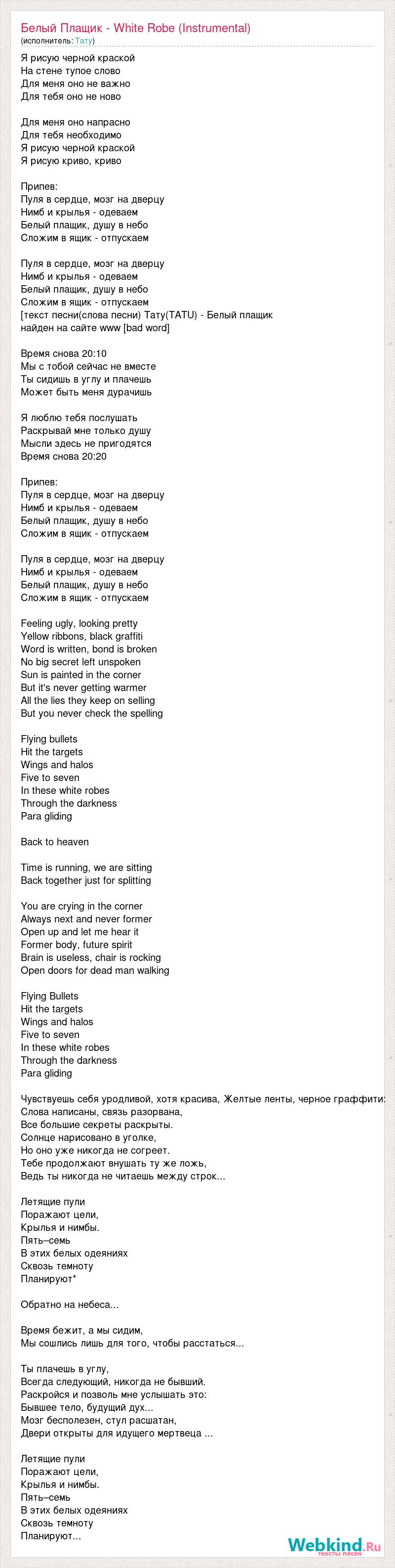 Я рисую черной краской На стене тупое слово Для меня оно не важно Для тебя оно не ново Для меня оно напрасно Для тебя необходимо Я рисую черной краской Я рисую криво, криво Припев: Пуля в сердце, мозг на дверцу Нимб и крылья - одеваем Белый плащик, душу в небо Сложим в ящик - отпускаем Пуля в сердце, мозг на дверцу Нимб и крылья - одеваем Белый плащик, душу в небо Сложим в ящик - отпускаем [текст песни(слова песни) Тату(TATU) - Белый плащик найден на сайте www [bad word] Время снова 20:10 Мы с тобой сейчас не вместе Ты сидишь в углу и плачешь Может быть меня дурачишь Я люблю тебя послушать Раскрывай мне только душу Мысли здесь не пригодятся Время снова 20:20 Припев: Пуля в сердце, мозг на дверцу Нимб и крылья - одеваем Белый плащик, душу в небо Сложим в ящик - отпускаем Пуля в сердце, мозг на дверцу Нимб и крылья - одеваем Белый плащик, душу в небо Сложим в ящик - отпускаем Feeling ugly, looking pretty Yellow ribbons, black graffiti Word is written, bond is broken No big secret left unspoken Sun is painted in the corner But it's never getting warmer All the lies they keep on selling But you never check the spelling Flying bullets Hit the targets Wings and halos Five to seven In these white robes Through the darkness Para gliding Back to heaven Time is running, we are sitting Back together just for splitting You are crying in the corner Always next and never former Open up and let me hear it Former body, future spirit Brain is useless, chair is rocking Open doors for dead man walking Flying Bullets Hit the targets Wings and halos Five to seven In these white robes Through the darkness Para gliding Чувствуешь себя уродливой, хотя красива, Желтые ленты, черное граффити: Слова написаны, связь разорвана, Все большие секреты раскрыты. Солнце нарисовано в уголке, Но оно уже никогда не согреет. Тебе продолжают внушать ту же ложь, Ведь ты никогда не читаешь между строк... Летящие пули Поражают цели, Крылья и нимбы. Пять–семь В этих белых одеяниях Сквозь темноту Планируют* Обратно на небеса... Время бежит, а мы сидим, Мы сошлись лишь для того, чтобы расстаться... Ты плачешь в углу, Всегда следующий, никогда не бывший. Раскройся и позволь мне услышать это: Бывшее тело, будущий дух... Мозг бесполезен, стул расшатан, Двери открыты для идущего мертвеца ... Летящие пули Поражают цели, Крылья и нимбы. Пять–семь В этих белых одеяниях Сквозь темноту Планируют...