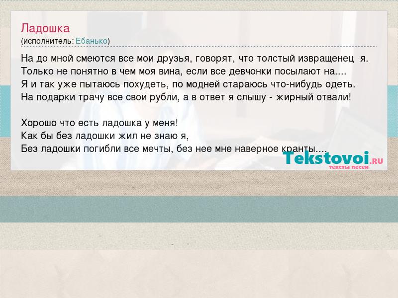На до мной смеются все мои друзья, говорят, что толстый извращенец я. Только не понятно в чем моя вина, если все девчонки посылают на.... Я и так уже пытаюсь похудеть, по модней стараюсь что-нибудь одеть. На подарки трачу все свои рубли, а в ответ я слышу - жирный отвали! Хорошо что есть ладошка у меня! Как бы без ладошки жил не знаю я, Без ладошки погибли все мечты, без нее мне наверное кранты....