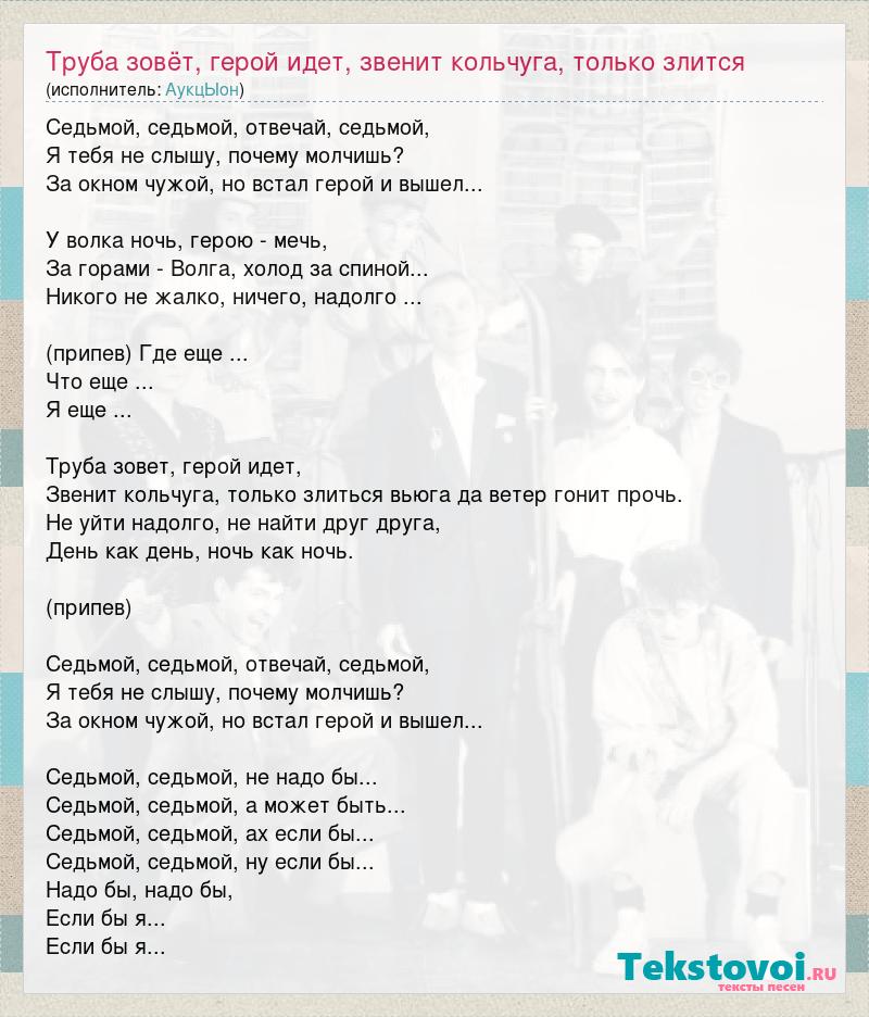 Седьмой, седьмой, отвечай, седьмой, Я тебя не слышу, почему молчишь? За окном чужой, но встал герой и вышел... У волка ночь, герою - мечь, За горами - Волга, холод за спиной... Никого не жалко, ничего, надолго ... (припев) Где еще ... Что еще ... Я еще ... Труба зовет, герой идет, Звенит кольчуга, только злиться вьюга да ветер гонит прочь. Не уйти надолго, не найти друг друга, День как день, ночь как ночь. (припев) Седьмой, седьмой, отвечай, седьмой, Я тебя не слышу, почему молчишь? За окном чужой, но встал герой и вышел... Седьмой, седьмой, не надо бы... Седьмой, седьмой, а может быть... Седьмой, седьмой, ах если бы... Седьмой, седьмой, ну если бы... Надо бы, надо бы, Если бы я... Если бы я...