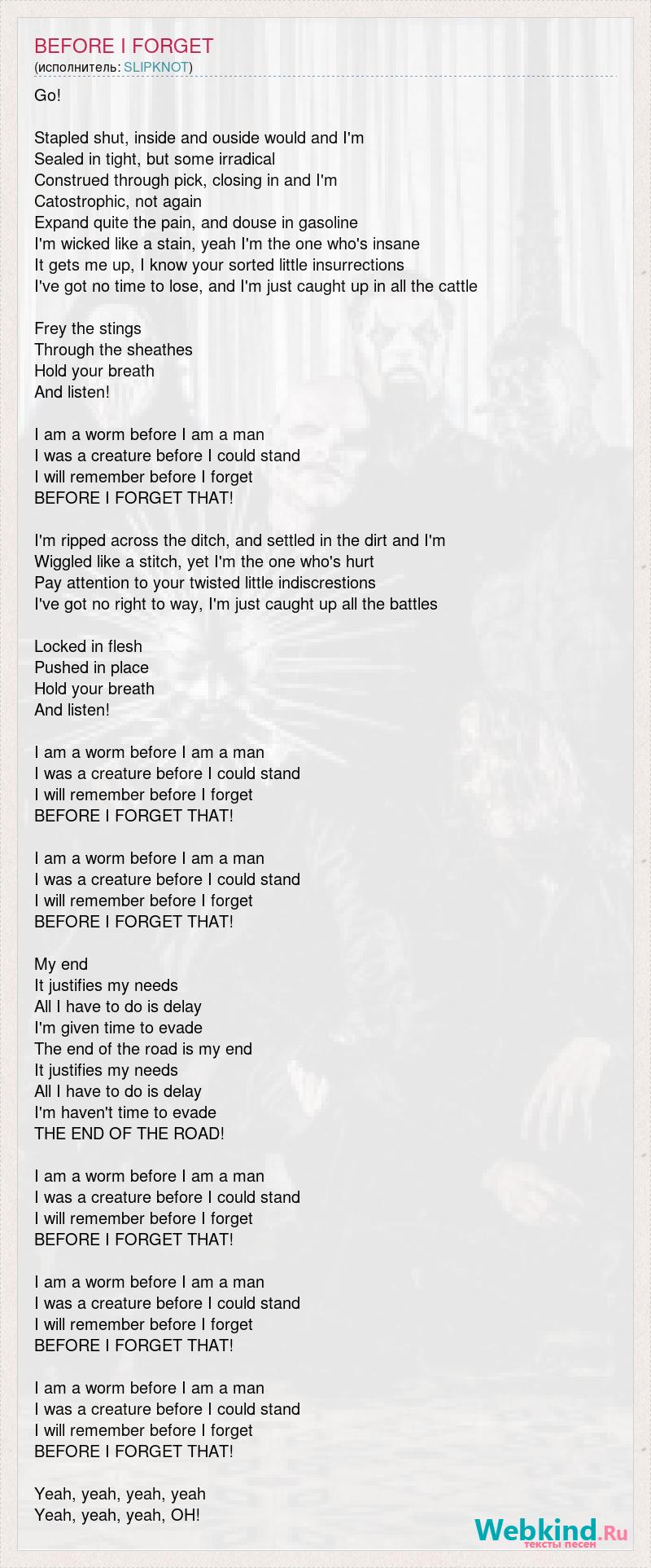 Go! Stapled shut, inside and ouside would and I'm Sealed in tight, but some irradical Construed through pick, closing in and I'm Catostrophic, not again Expand quite the pain, and douse in gasoline I'm wicked like a stain, yeah I'm the one who's insane It gets me up, I know your sorted little insurrections I've got no time to lose, and I'm just caught up in all the cattle Frey the stings Through the sheathes Hold your breath And listen! I am a worm before I am a man I was a creature before I could stand I will remember before I forget BEFORE I FORGET THAT! I'm ripped across the ditch, and settled in the dirt and I'm Wiggled like a stitch, yet I'm the one who's hurt Pay attention to your twisted little indiscrestions I've got no right to way, I'm just caught up all the battles Locked in flesh Pushed in place Hold your breath And listen! I am a worm before I am a man I was a creature before I could stand I will remember before I forget BEFORE I FORGET THAT! I am a worm before I am a man I was a creature before I could stand I will remember before I forget BEFORE I FORGET THAT! My end It justifies my needs All I have to do is delay I'm given time to evade The end of the road is my end It justifies my needs All I have to do is delay I'm haven't time to evade THE END OF THE ROAD! I am a worm before I am a man I was a creature before I could stand I will remember before I forget BEFORE I FORGET THAT! I am a worm before I am a man I was a creature before I could stand I will remember before I forget BEFORE I FORGET THAT! I am a worm before I am a man I was a creature before I could stand I will remember before I forget BEFORE I FORGET THAT! Yeah, yeah, yeah, yeah Yeah, yeah, yeah, OH!
