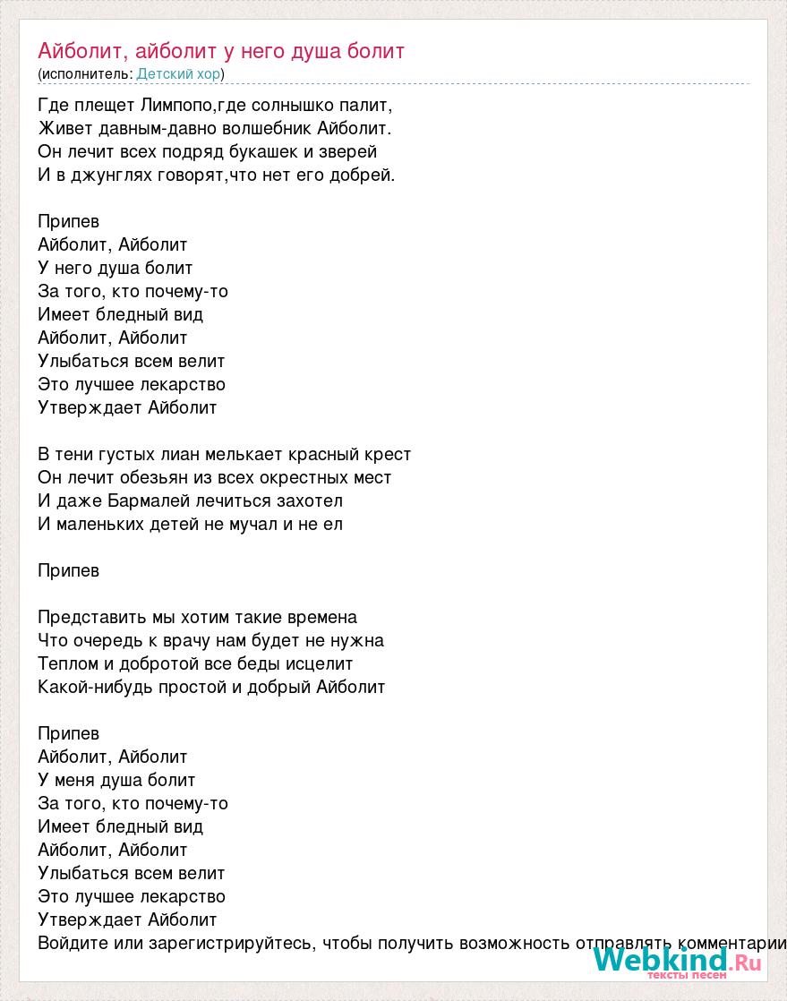 Где плещет Лимпопо,где солнышко палит, Живет давным-давно волшебник Айболит. Он лечит всех подряд букашек и зверей И в джунглях говорят,что нет его добрей. Припев Айболит, Айболит У него душа болит За того, кто почему-то Имеет бледный вид Айболит, Айболит Улыбаться всем велит Это лучшее лекарство Утверждает Айболит В тени густых лиан мелькает красный крест Он лечит обезьян из всех окрестных мест И даже Бармалей лечиться захотел И маленьких детей не мучал и не ел Припев Представить мы хотим такие времена Что очередь к врачу нам будет не нужна Теплом и добротой все беды исцелит Какой-нибудь простой и добрый Айболит Припев Айболит, Айболит У меня душа болит За того, кто почему-то Имеет бледный вид Айболит, Айболит Улыбаться всем велит Это лучшее лекарство Утверждает Айболит Войдите или зарегистрируйтесь, чтобы получить возможность отправлять комментарии